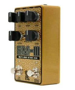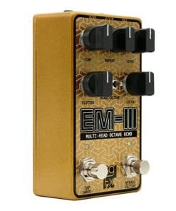 ¡Bienvenido al nuevo SolidGoldFX EM-III Multi-Head Octave Echo! El pedal de delay más pequeño, potente y versátil de SolidGoldFX hasta la fecha. Basándose en el legado del Electroman Delay de SGFX, el EM-III logra eco del pasado, presente y futuro. Con el conjunto de controles intuitivos pero amplios del EM-III, colocar ecos cálidos de estilo analógico, delays precisos y modernos, así como diseños de sonido experimentales y futuristas, todo está a un solo paso de distancia. A tus pies (o dedos) tienes un eco de cinta de varios cabezales, con la capacidad de añadir a la señal una octava más baja al cabezal de delay principal. Esto puede resultar en delays rítmicos y danzantes con cuerpo y gravedad, así como paisajes sonoros audaces y envolventes. Estas dos características principales se controlan mediante un solo mini interruptor. Gíralo a la izquierda para seleccionar entre 1, 2 o 3 cabezales de delay o a la derecha para alternar el efecto de octava. A partir de ahí, sólo tienes que ajustar tu Nivel de Delay, Repeticiones y Tiempo a través de las perillas o marcar tu tempo preferido tocando el interruptor de tap tempo de clic suave y dejar que los buenos tiempos de eco rueden. El EM-III también cuenta con modulación de delay introducida a través del control Flutter. Mantenlo en posición central para ninguna modulación. Gíralo a la izquierda para una modulación lenta y soñadora similar a un coro o a la derecha para un vibrato más rápido, lo que te permite crear movimiento oceánico lujoso, arrugas de estilo cinta, tensión inquietante y disonancia hermosa. La perilla de color te permite activar tanto el filtrado de paso alto como el de paso bajo. Centro muerto