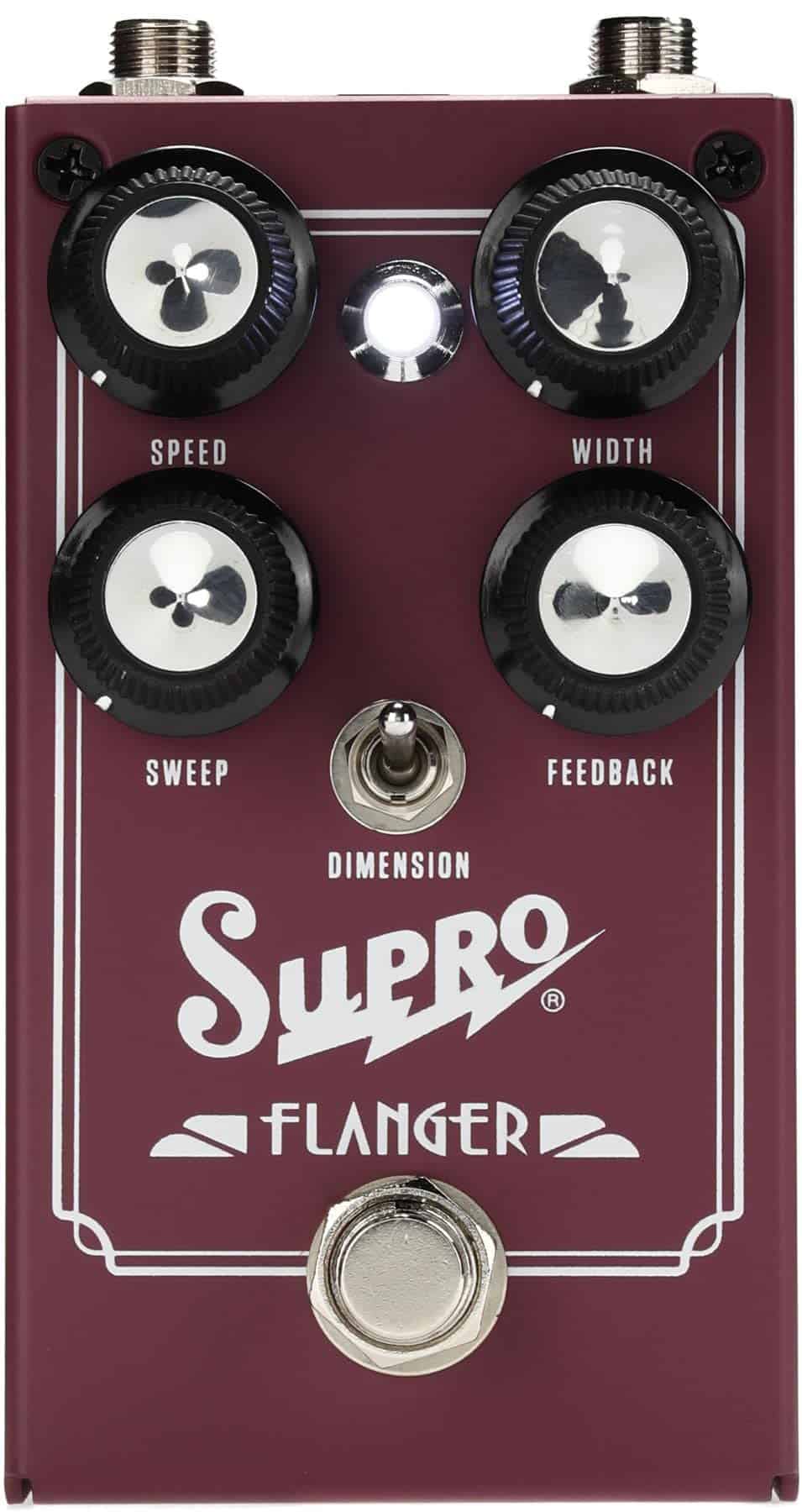 1. Pedal de efecto de Flanger analógico con velocidad. 2. Controles de dimensión. 3. Retroalimentación. 4. Ancho. 5. Barrido