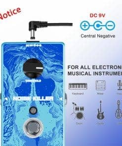 Instrucciones de Operación: 1.Pedal de Bypass Verdadero Pulsar el pedal para alternar entre efectos y estado de bypass. 2. Luz indicadora LED Muestra el estado de encendido/apagado. 3. Botón de Umbral Ajusta la reducción de ruido. 4. Jack de Entrada Jack mono de audio 1/4», entra la señal. 5. Jack de Salida Jack mono de audio 1/4», sale la señal. 6. Jack de Alimentación DC Entrada Jack de alimentación DC 9V regulada por adaptador AC (La polaridad del enchufe es positiva en el barril y negativa en el centro) Este Pedal de Efectos de Guitarra RE01 también se puede conectar a una batería DC 9V y consultar el manual de usuario (Este dispositivo se envía sin batería) Especificaciones: Impedancia de Entrada: 450K Ohms Impedancia de Salida: 1k Ohms Corriente de Trabajo: 6mA Fuente de Alimentación: Batería DC 9V / adaptador (El adaptador de corriente de 9V o la batería de 9V no están incluidos en este paquete) Dimensiones: 112(D) 60(W) 45(H)mm Peso: 350g (Con caja) Precauciones: No desarme, modifique ni repare el dispositivo sin autorización para evitar cortocircuitos. No utilice el dispositivo en lugares con alta temperatura, humedad, suciedad y vibración fuerte. No deje caer el dispositivo o permita que caiga sobre una superficie dura para evitar que el dispositivo funcione de forma anormal. No frotes la superficie del dispositivo con líquidos diluidos como alcohol para evitar daños en el dispositivo. Por favor, retire la batería cuando el dispositivo no se utilice durante mucho tiempo. No deseche las pilas usadas como residuos generales. Paquete incluido: 1 x Pedal Rowin Noise Killer (RE03) 1 x Manual de Usuario