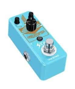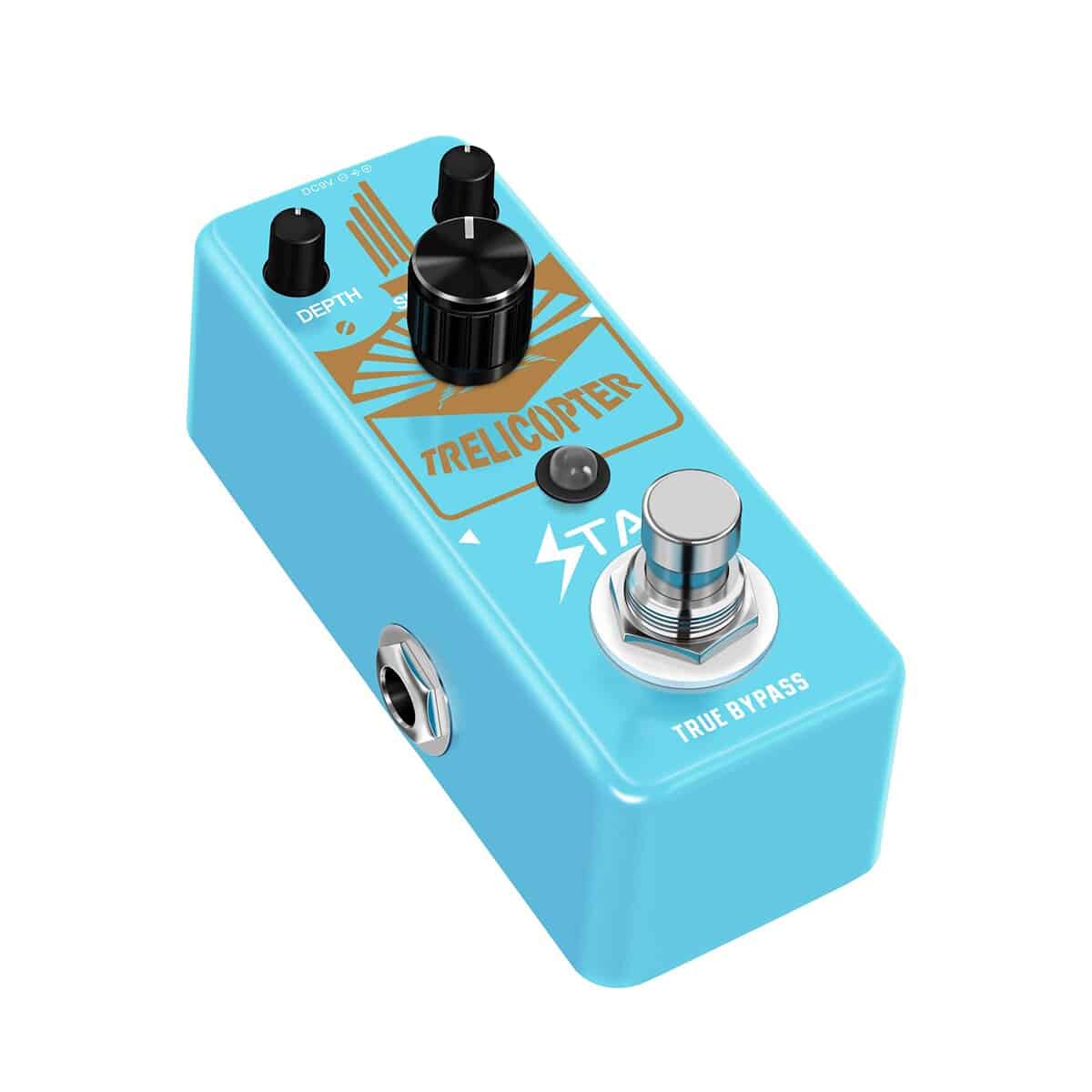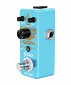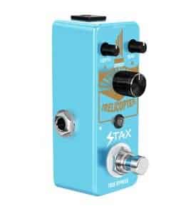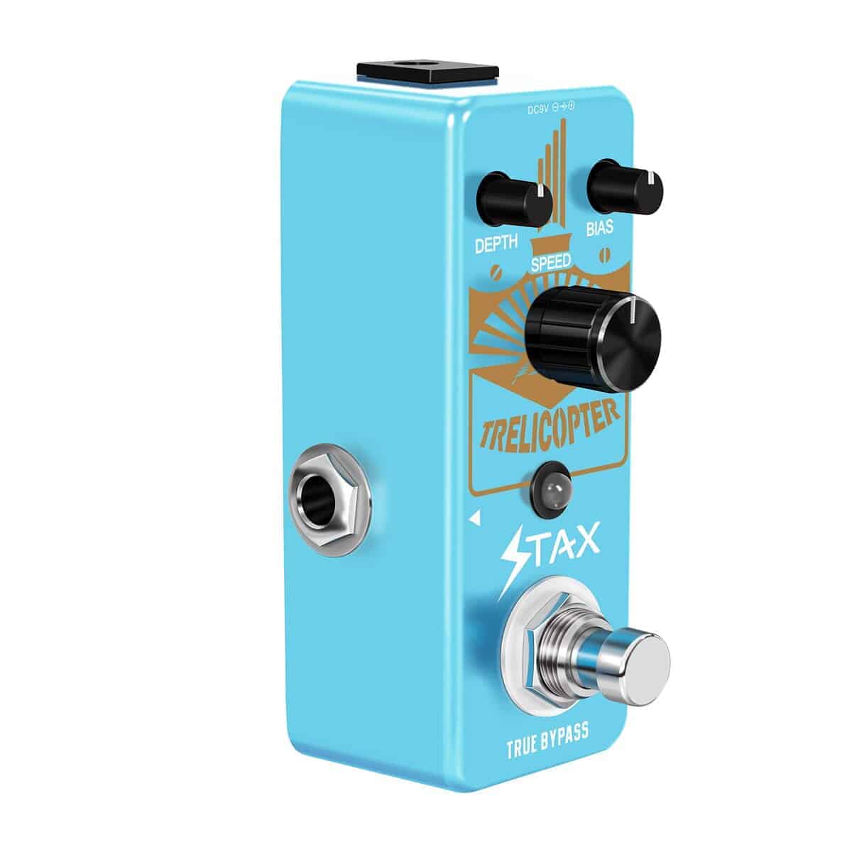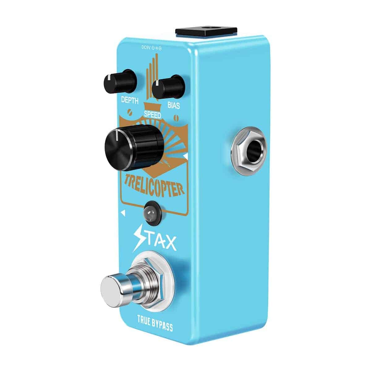 Un pedal de tremolo de circuito analógico. El pedal de efectos de tremolo Stax Trelicopter ofrece efectos de tremolo clásicos con una amplia gama de velocidades y profundidades. Puedes ajustar el color del sonido con la perilla BIAS. Su carcasa de metal completo lo hace duradero y resistente, y al igual que la mayoría de los grandes pedales de efectos, tiene true bypass. Características Alimentación: 9V DC (Negativo en el centro). Perilla de Profundidad: Controla la profundidad del efecto de tremolo. Perilla de Bias: Ajusta el bias del óptico de la unidad de tremolo. Perilla de Velocidad: Ajusta la velocidad del efecto de tremolo. Entrada Salida Jack: Análogo a través de jack de audio mono de 1/4 pulgadas. Luz LED: El indicador LED muestra el estado de trabajo. True Bypass: True bypass para cero coloración de tono. Hecho de aleación de zinc de alta calidad con una construcción super sólida. Especificaciones Corriente de trabajo: 26mA. Dimensiones: 95(D)45(W)48(H)mm. Peso: 273g (Con caja) Paquete incluido: 1 x Pedal de efecto de guitarra tremolo Stax 1 x Manual del Usuario 1 x Caja de Embalaje
