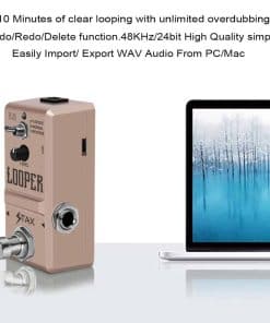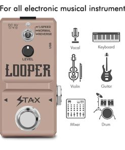 Pedal de Loop Stax Looper Pedal Super mini size, hecho de aleación de aluminio, conveniente y duradero. Con grabación (hasta 10 minutos), overdub (ilimitado), deshacer, rehacer y funciones de eliminación. Operación sencilla, una tecla para lograr casi todas las funciones. Con un botón para ajustar el volumen de salida. Viene con un cable USB para cargar y descargar archivos de audio desde PC. Especificaciones: Corriente de trabajo: 96 mA; Nivel de volumen de salida ajustable con perilla; Jack de Entrada: 1/4 mono para conectar Guitarra; Jack de Salida: 1/4 mono para salida de señal; Conector de alimentación DC In Power Jack DC 9V (negativo en el centro); Verdadero Bypass Footswitch. Empaque incluye: 1 Pedal de Loop Stax Looper, 1 Cable USB, 1 Manual de Usuario, 1 Caja de Empaque.