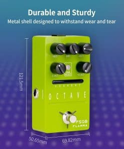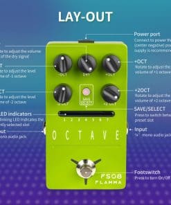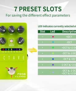 Pedal de octava FLAMMA FS08 para guitarra eléctrica. Este pedal ofrece una amplia gama de ajustes de octava polifónica para enriquecer tu sonido con efectos precisos y sin distorsiones. Cuenta con 7 ranuras de preselección que te permiten guardar tus configuraciones favoritas, incluyendo efectos de octava simple, doble o combinada. El diseño práctico y amigable facilita el ajuste de parámetros mediante una perilla intuitiva. Además, dispone de controles individuales para las octavas 1 y 2, así como para la señal seca, permitiéndote personalizar aún más tu tono. Fabricado con componentes de alta calidad y una resistente carcasa de metal verde, este pedal es duradero, portátil y ofrece un rendimiento fiable. Asegúrate de alimentarlo con una fuente de 9V DC con al menos 306mA para un funcionamiento óptimo. Transforma tu sonido con el pedal de octava FLAMMA FS08 y experimenta nuevas posibilidades creativas en tu música.