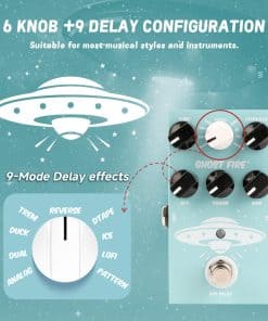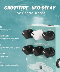 El Pedal de Retardo GHOSTFIRE para Tableros de Pedales te ofrece una amplia variedad de efectos de retardo para mejorar tu música. Con 9 modos de retardo distintos, incluido el clásico ANALÓGICO, DUAL, DUCK, TREM, el innovador REVERSE, la cinta dTAPE, el soñador ICE, el vintage LOFI y los efectos de PATRÓN, podrás darle a tu música diferentes tonos y matices. Las 5 perillas de control te permiten ajustar el tiempo de retardo, la mezcla de efectos, la retroalimentación, los parámetros y la modulación para personalizar tu sonido. Este pedal compacto y portátil es ideal para músicos en movimiento y ofrece una calidad de sonido superior con hasta 3000ms de tiempo de retardo. El diseño de aleación de aluminio lo hace resistente y duradero, perfecto para uso diario y actuaciones en vivo. Disfruta de efectos de retardo únicos y creativos con el Pedal de Retardo GHOSTFIRE.