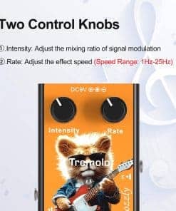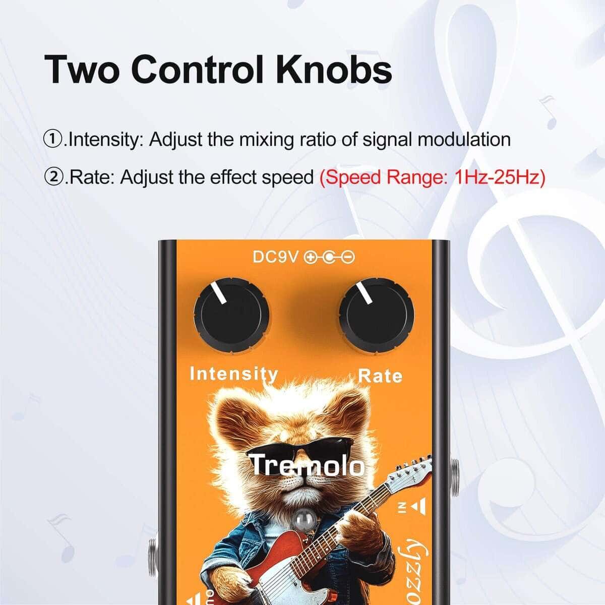 1. Dos perillas de control: Este es el tremolo de los queridos amplificadores de tubo clásicos. Las perillas de Intensity y Rate facilitan ajustar el tono y la vibra.