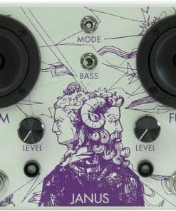 Pedal Walrus Audio Janus Tremolo/Fuzz. El Janus es un pedal True Bypass controlado por dos joysticks que te permite crear paisajes de texturas distorsionadas. Tanto el Tremolo como el Fuzz pueden ser utilizados por separado, pero también en serie creando texturas gruesas con mucho movimiento. Cada joystick tiene un eje X y Y separado con controles designados. El joystick Tremolo controla la velocidad y profundidad, mientras que el joystick Fuzz controla la cantidad de fuzz y el tono. Hay controles individuales de volumen para ambos efectos y un control de mezcla para el Fuzz que permite al usuario mezclar la señal no afectada con la señal de fuzz afectada. Los controles de joystick hacen que el Janus sea una excelente opción para guitarras, voces, teclados o pistas.