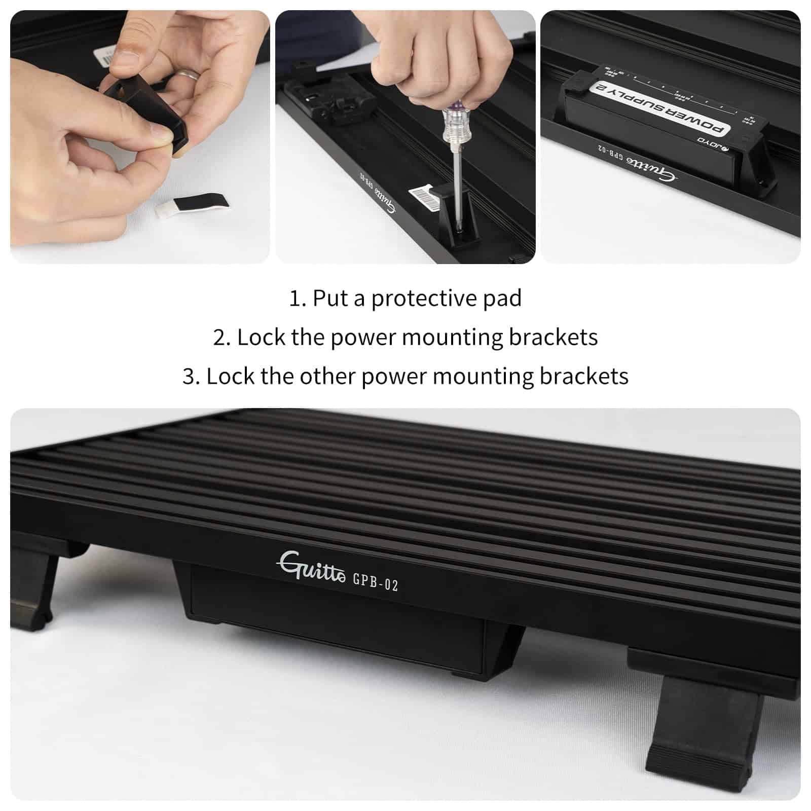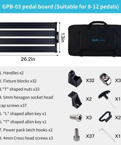 Las pedaleras GPB son innovadoras, orientadas al ser humano y fáciles de usar, pueden fijar diferentes formas de pedales. Con el chasis plegable en la parte inferior, ahorro de espacio y portátil, perfecto para actuaciones de guitarra. Puedes fijar los pedales en las pedaleras rápidamente con los bloques de fijación. Además, la estructura de aleación de aluminio garantiza la máxima capacidad de carga y resistencia al impacto. Características: 1. Hecho de aleación de aluminio, puede soportar un fuerte tramo 2. Con chasis plegable y oculto debajo, ahorro de espacio y portátil 3. Trae un nuevo método de fijación de pedales, es decir, fijar los pedales rápidamente 4. Presentan ergonomía y son muy fáciles de usar 5. Diseño de todos los protectores de bordes, ayuda a proteger contra arañazos 6. Con herramientas específicas adjuntas, fácil y conveniente de operar 7. La superficie del metal ha sido sometida a un tratamiento de oxidación, firmeza y solidez 8. Estructura de bloques de construcción, disponibles varios tamaños 9. Color: negro Lista de embalaje: 1. Pedalera GPB-03 2. Manijas 2 3. Bloques de fijación 32 (configuración estándar) 4. Tuerca en forma de T 33 5. Tornillos de cabeza hexagonal de 5 mm 37 6. Llave allen en forma de L 1 7. Llave allen en forma de T 1 8. Ganchos de cierre de paquete de energía 2 9. Tornillos de cabeza cruzada de 4 mm 310. Bolsa de transporte 1