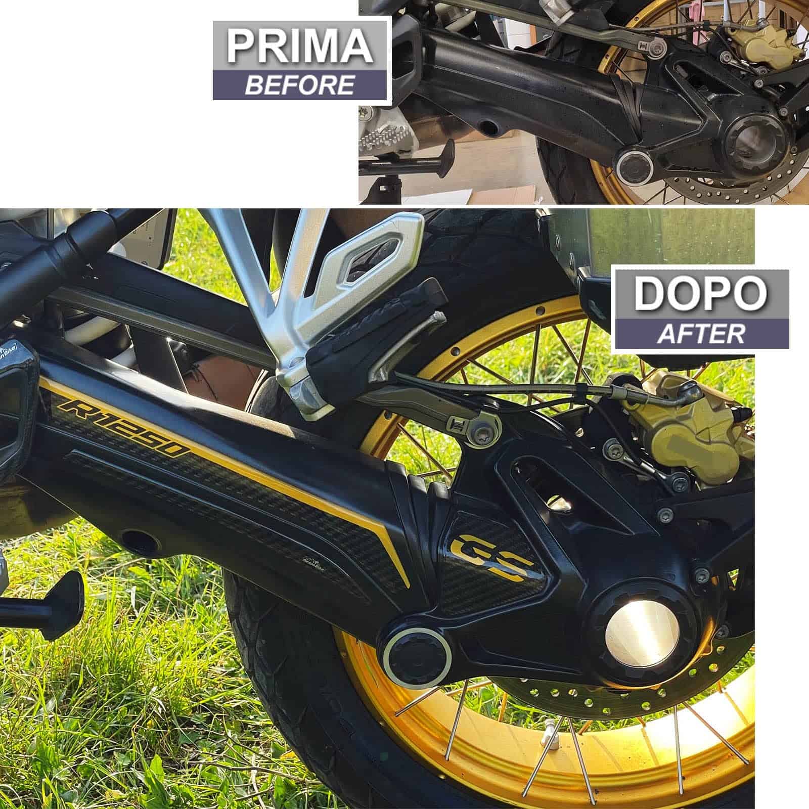 5. FÁCIL DE APLICAR: Manipule la pegatina exclusivamente desde los bordes evitando tocar la parte adhesiva con las manos, aplique el adhesivo manteniéndolo perfectamente alineado con la forma de la moto para evitar acciones de pegado y despegado que podrían comprometer la estanqueidad del pegamento con el tiempo. Recomendamos empezar por un lado y eliminar suavemente cualquier burbuja de aire a medida que avanza hacia el lado opuesto