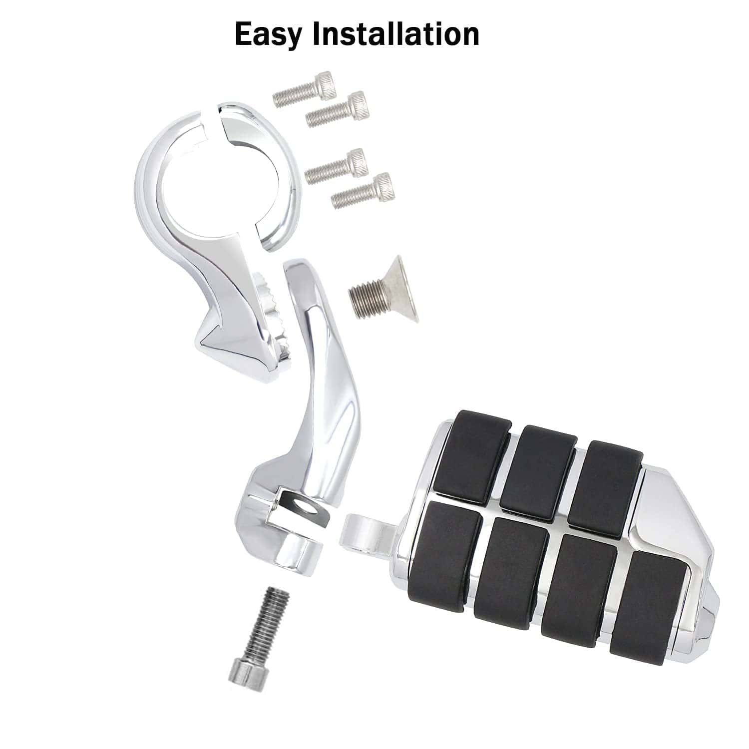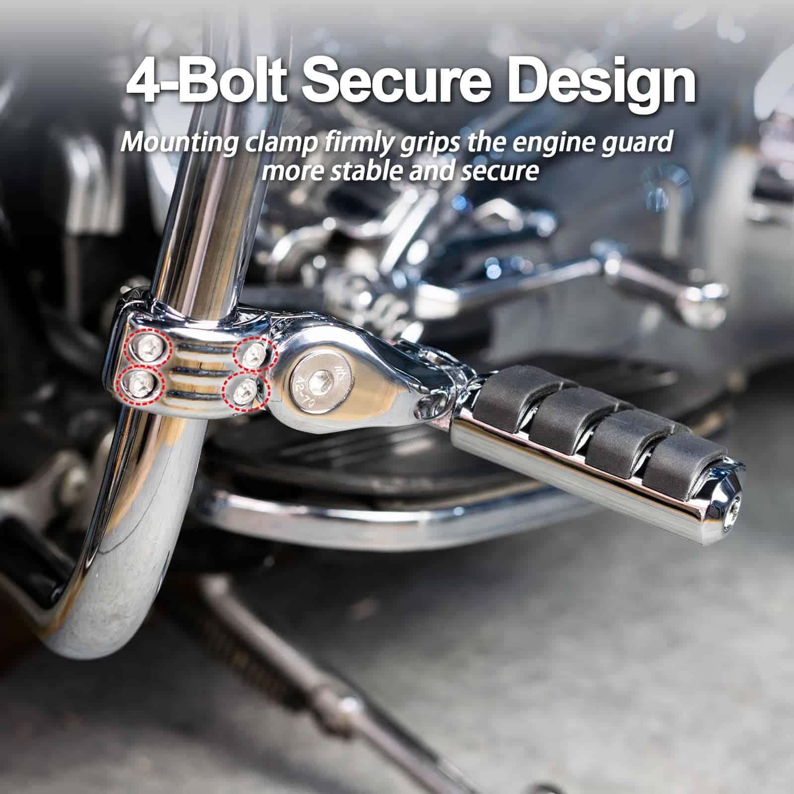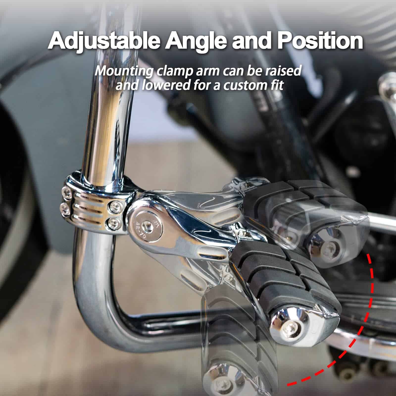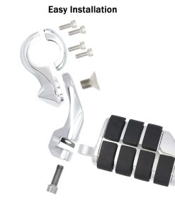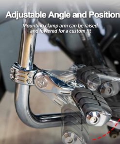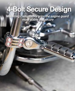 1. Material: Hecho de aluminio macizo de alta resistencia y goma de primera calidad que no se despega fácilmente; Color: Cromo. 2. Nueva abrazadera de montaje de generación: Nueva abrazadera de montaje de nueva generación, se ajustan mucho mejor y son muy seguros con abrazadera de cuatro pernos. 3. Multi-Ángulos Ajustables: El pedal y la abrazadera de montaje del pie son ajustables 360, puedes ajustar el ángulo y la posición cómodos. 4. Compatibilidad: Compatible con Harley Touring Road King Street Glide Road Glide Electra Glide con barra de carretera de 1 1/4 pulgadas; Compatible de forma universal en protectores de motor o tubos de 1 1/4 pulgadas; requiere 1 1/4 pulgadas de tubo de protector de motor recto para montaje de abrazadera (Por favor, verifica tu modelo y tamaño de protector de motor, si el diámetro de tu protector de motor no es de 1 1/4 pulgadas, no encajarán). 5. Nota: Nuestras abrazaderas de montaje han sido actualizadas nuevamente. Los problemas de instalación del producto se han resuelto y se pueden instalar fácilmente. Si hay un problema con la versión antigua que compraste, por favor contáctanos para reemplazar la nueva versión.
