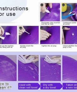 6. Inflado óptimo: Después de la inflación inicial, deje la pelota en su lugar durante 2-3 días, cuando la pelota se estira, puede inflarse nuevamente para estirarla al tamaño y resistencia adecuados. Nota importante: No tire la pelota de ejercicio sobre muebles de madera o paredes pintadas, ya que la madera o la pintura no son amigables con la pelota.