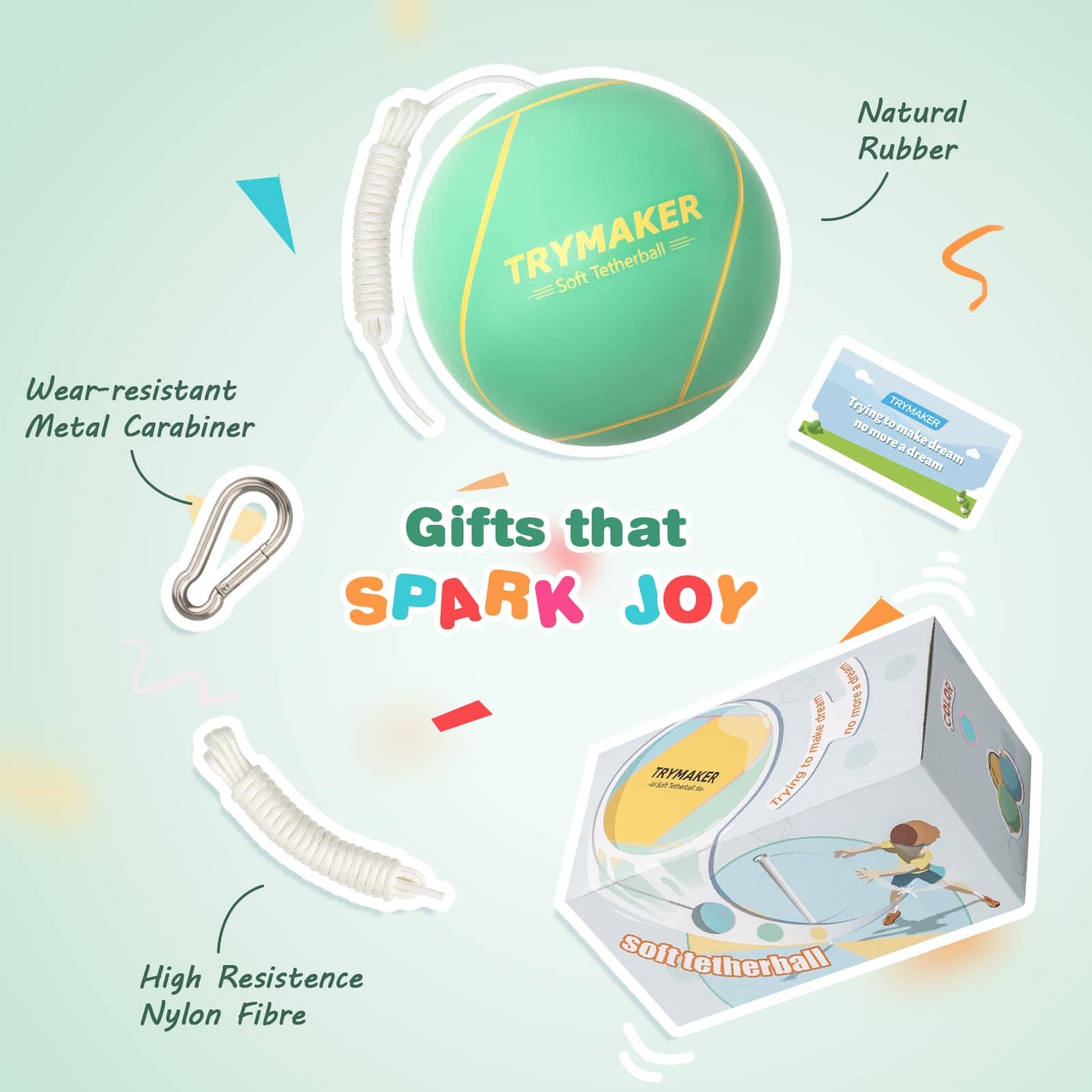 1. Tres excelentes materiales envuelven la pelota de Tetherball de Trymaker como una estructura de tres capas, ¡sin miedo a ningún tipo de juego!.