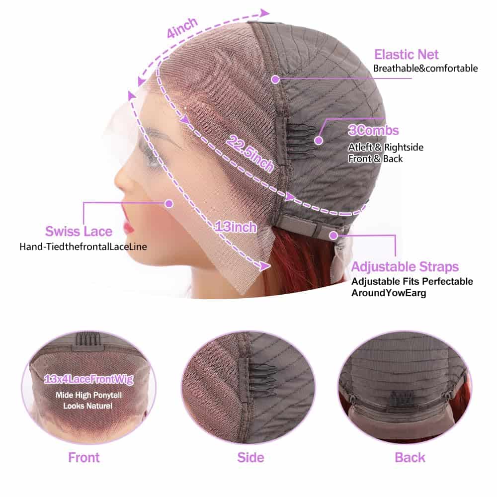 5. Capa de Pelucas de Bob con Cordón Frontal: Peluca Bob Rojiza Recta Corta de Cabello Humano tiene Tamaño de Gorro Mediano (22 Pulgadas – 22.5 Pulgadas), se adapta a la mayoría de las mujeres, con 2 correas ajustables y 3 peines, fácil de instalar, amigable con la piel y transpirable, brindándote una experiencia de uso más cómoda.