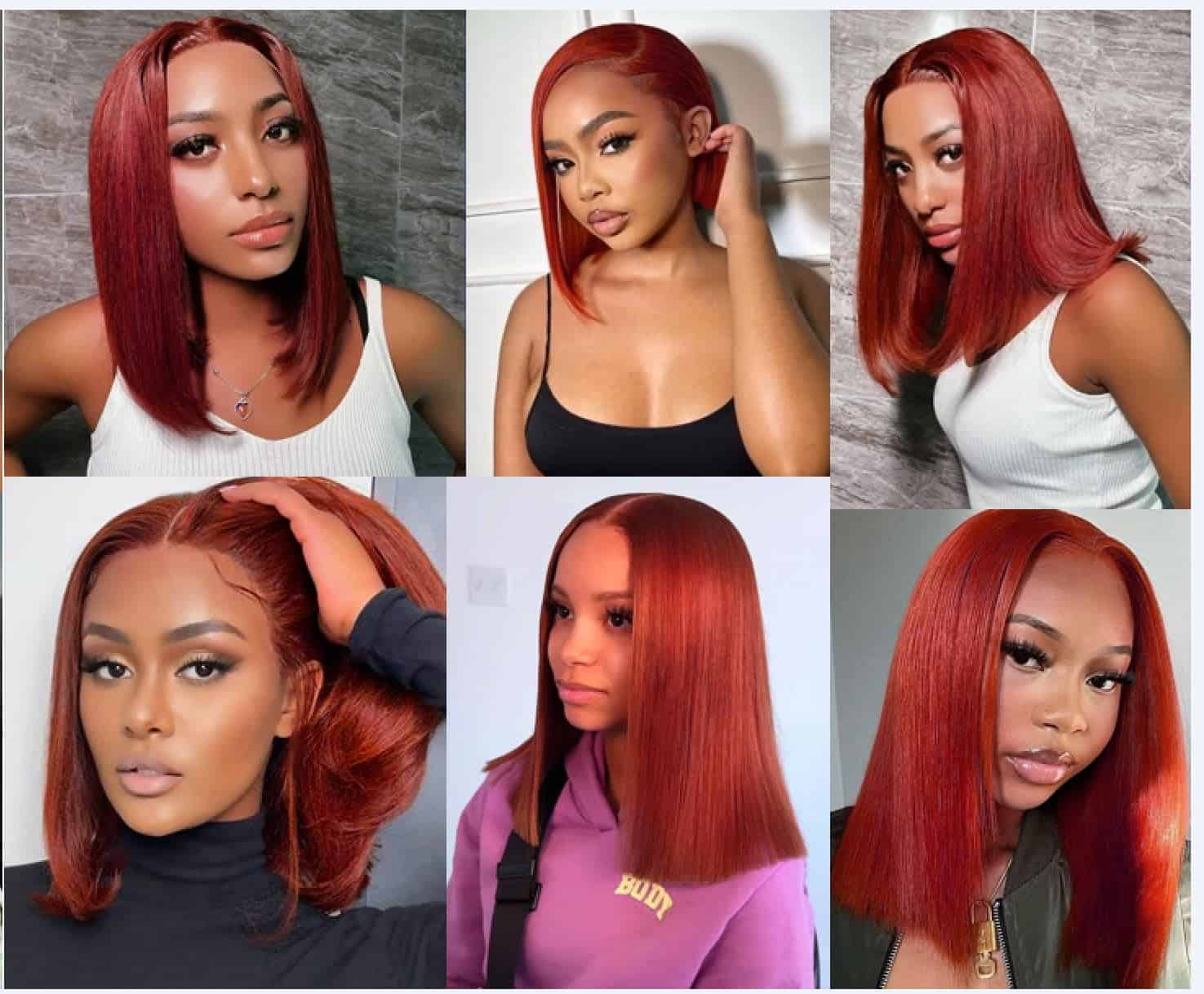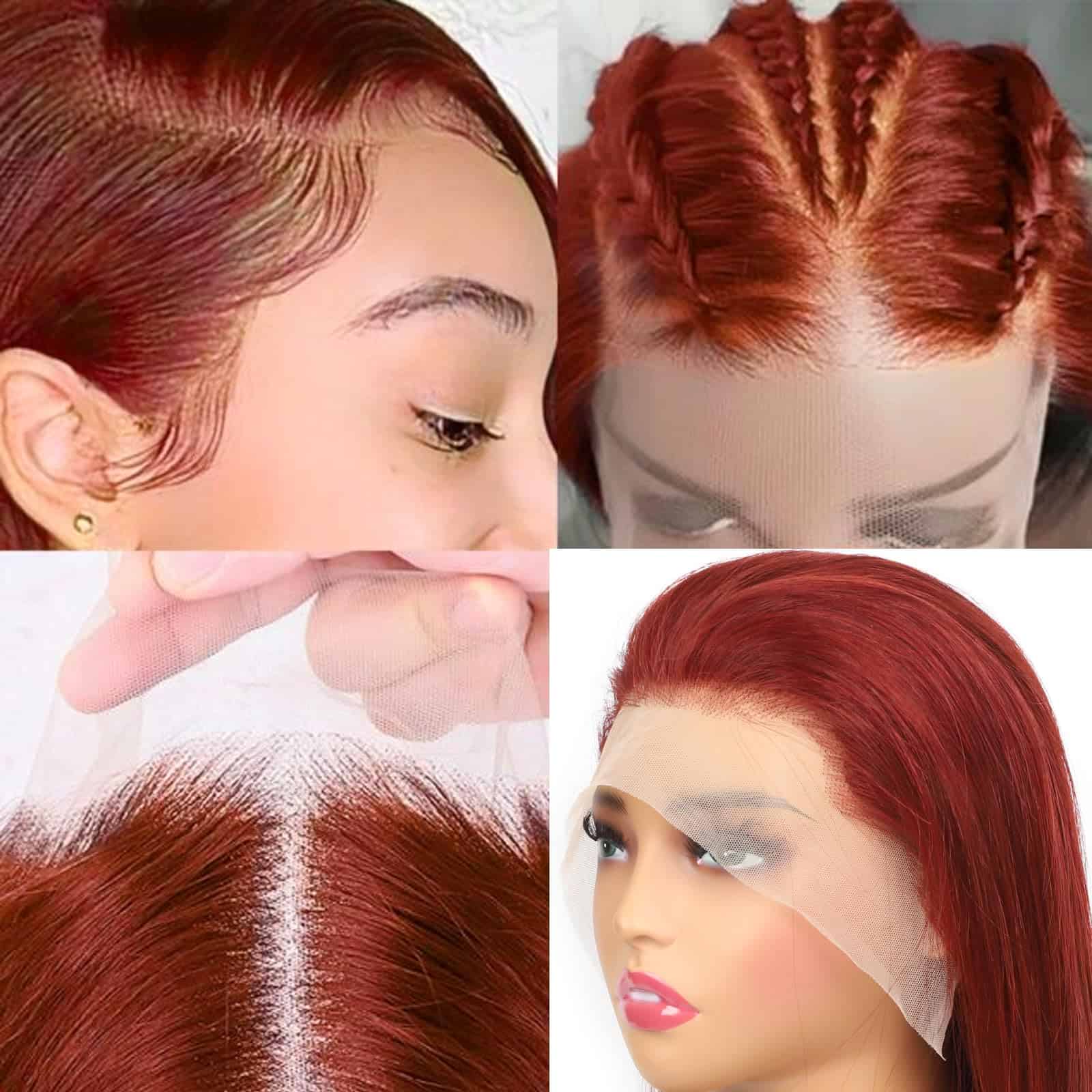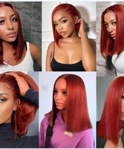 1. Cabello Humano de Alta Calidad: Peluca Bob Rojiza 13×4 HD Lace Front utiliza 100% cabello humano brasileño liso 12A sin procesar, recolectado de un solo donante sin alteraciones químicas, natural y saludable, suave y esponjoso, completo y grueso.