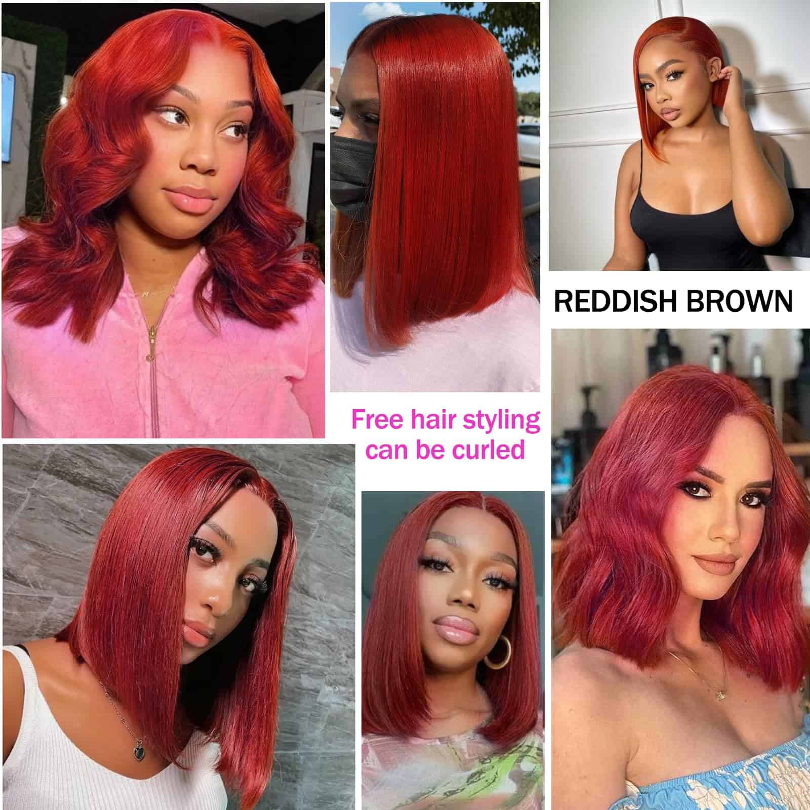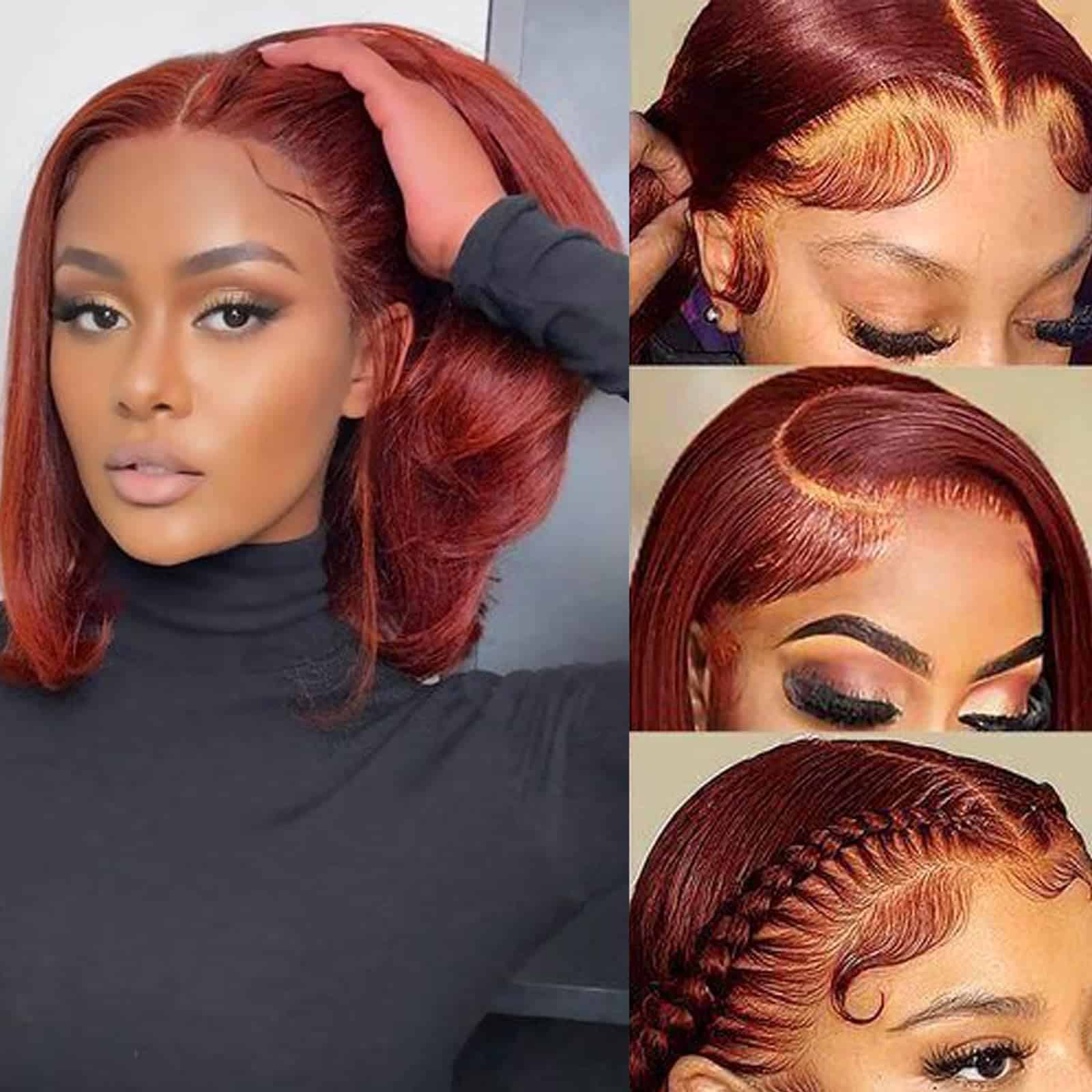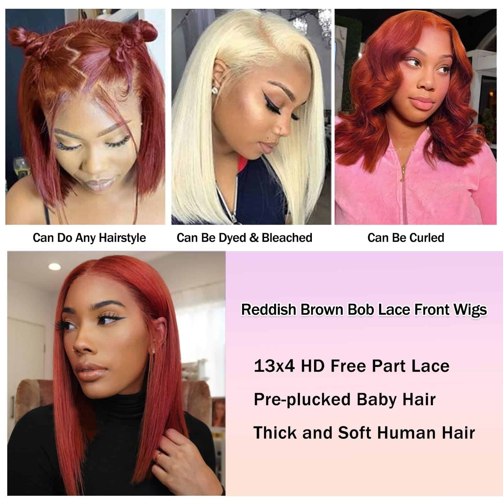2. Densidad de Cabello Humano 180%: Peluca Bob Rojiza 13×4 HD Lace Front utiliza 180% de Densidad de Cabello Humano Virgen, Volumen Completo que lo hace Grueso y Completo, Natural y Saludable, Suave y Seda, Sin Puntas Abiertas, Muy Brillante. Puede ser Teñido, Decolorado, Alisado y Restilizado.