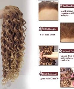 1. Tipo de Peluca: Peluca sintética honey blonde curly frontal de encaje largo para mujeres adecuada para cosplay, disfraces de Halloween, bodas, cumpleaños, fiestas diarias.