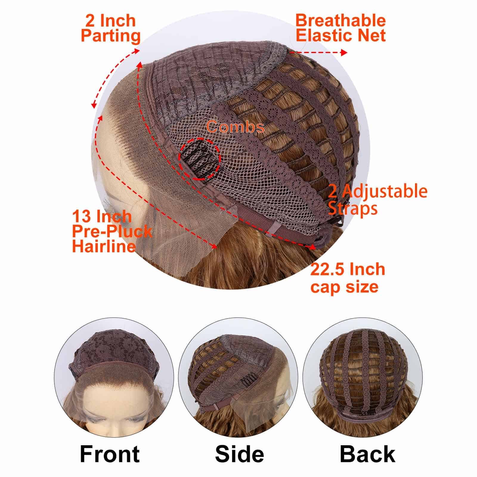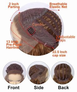 2. GORRA AJUSTABLE Y RED TRANSPIRABLE: Las gorras de red de la peluca honey brown frontal de encaje tienen correas ajustables con 2 ganchos y 3 peines en el interior. Puede ajustar las correas usted misma.