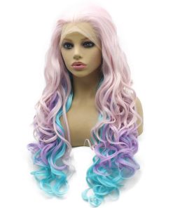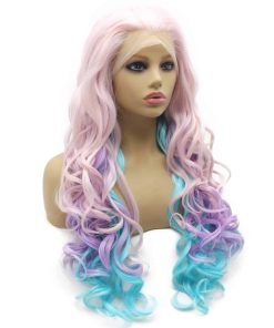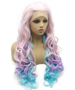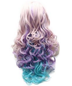 Peluca larga ondulada suiza de color rosa, azul y morado de