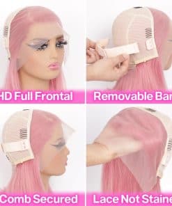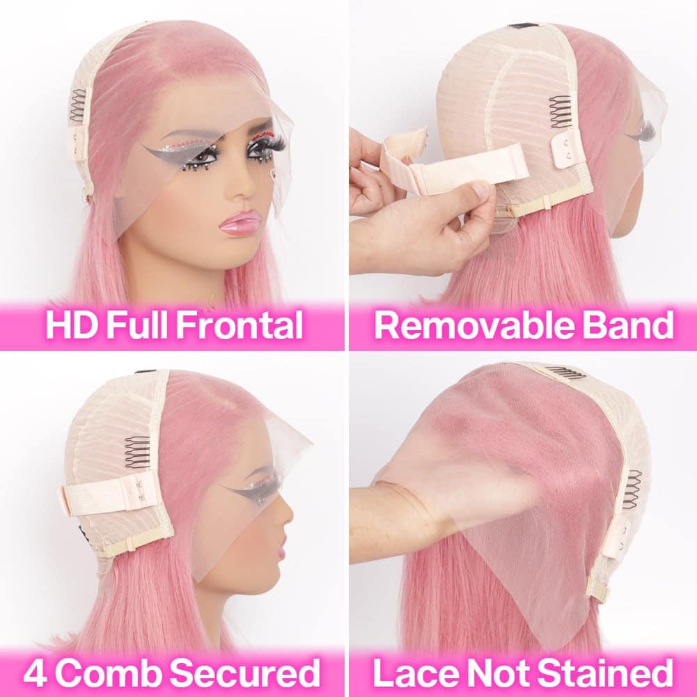 2. Peluca de Bob de Encaje Frontal La Densidad de la Peluca de Bob Rosa de Cabello Humano es de aproximadamente 180%. Tamaño de Gorra Promedio (22.5 pulgadas) con Correas Ajustables y 3 Peines, Estable, Sólido y Fácil de Llevar.