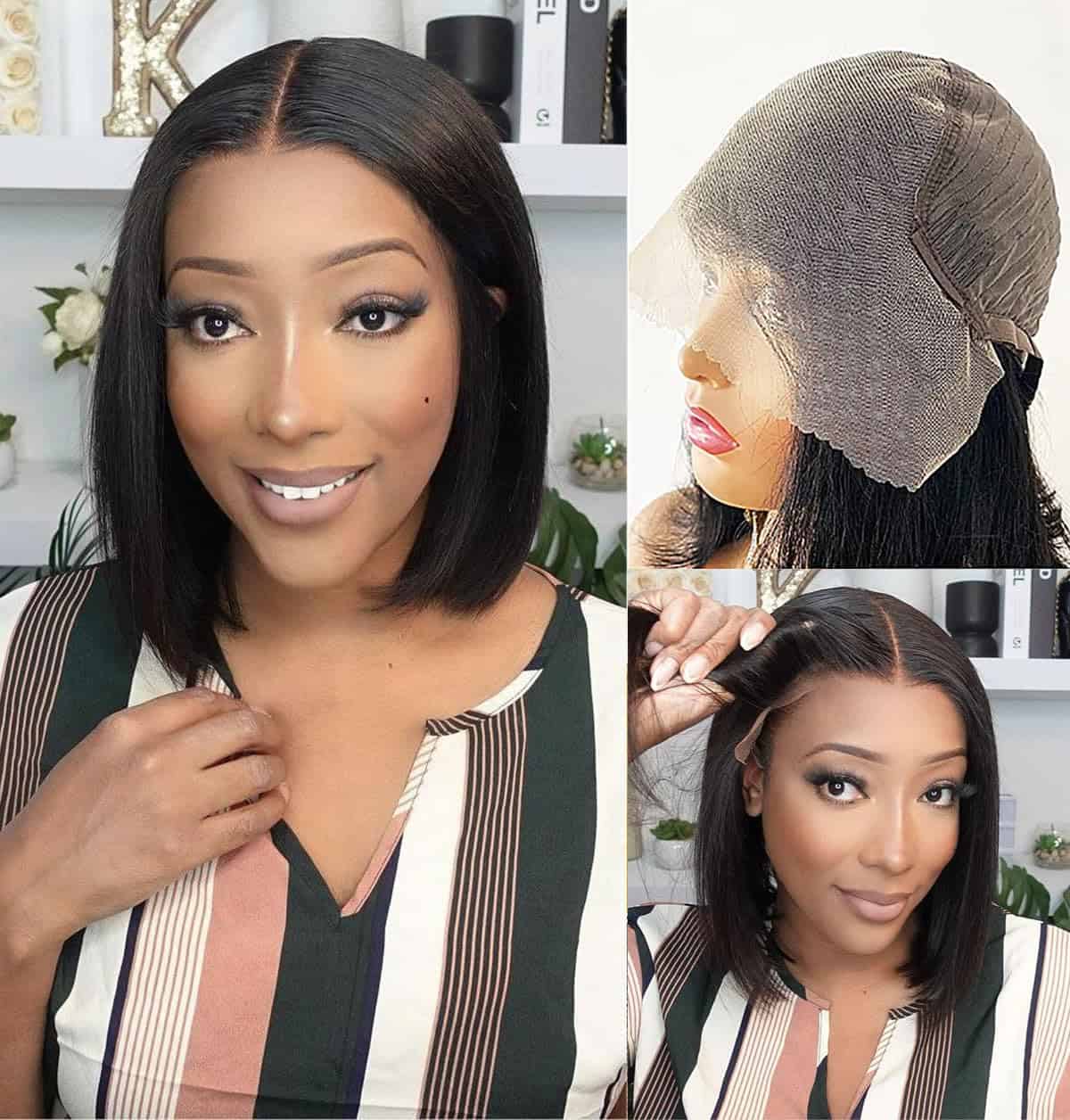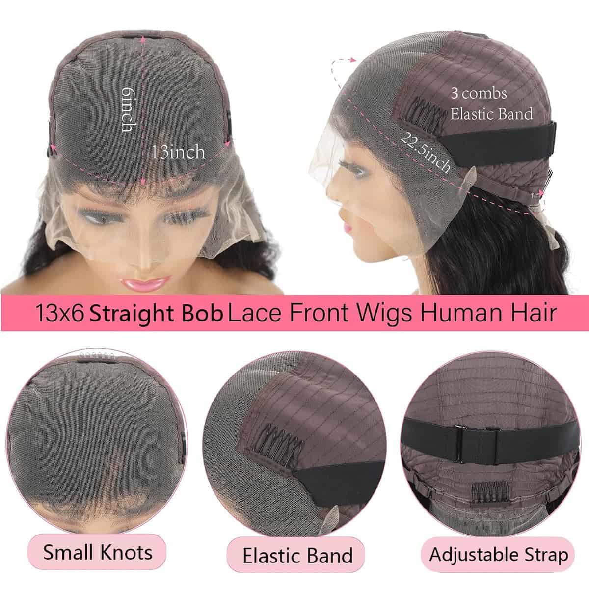 3. Ventaja de la Peluca de Cabello Humano Bob: Nuestras pelucas de cabello humano Bob 13×6 frontal tienen un gran espacio y una partición profunda de encaje de 13×6, según tu estilo, puedes hacer un partidomedio, lateral o libre. Nuestras pelucas son de tamaño medio (21.5 pulgadas – 22.5 pulgadas) con 3 peines y correas ajustables, cómodas de usar, al mismo tiempo, se estiran ultramente para adaptarse a la mayoría de las personas, especialmente a las personas con cabezas grandes, verdadera comodidad para usar en todas las estaciones.