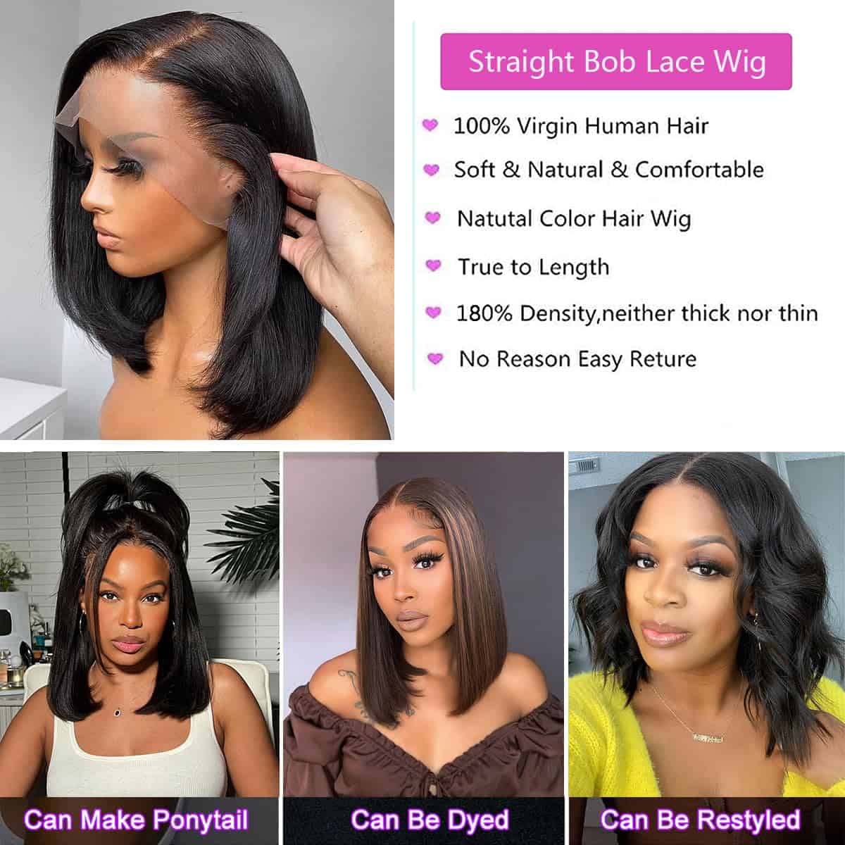 1. Material de peluca de cabello humano Bob: Pelucas de cabello humano virgen brasileño sin procesar de grado 10A, cortadas directamente de donantes jóvenes, limpias y cómodas contra la piel. Se pueden teñir, rizar, decolorar y remodelar. Más fácil y conveniente y amigable especialmente para principiantes.