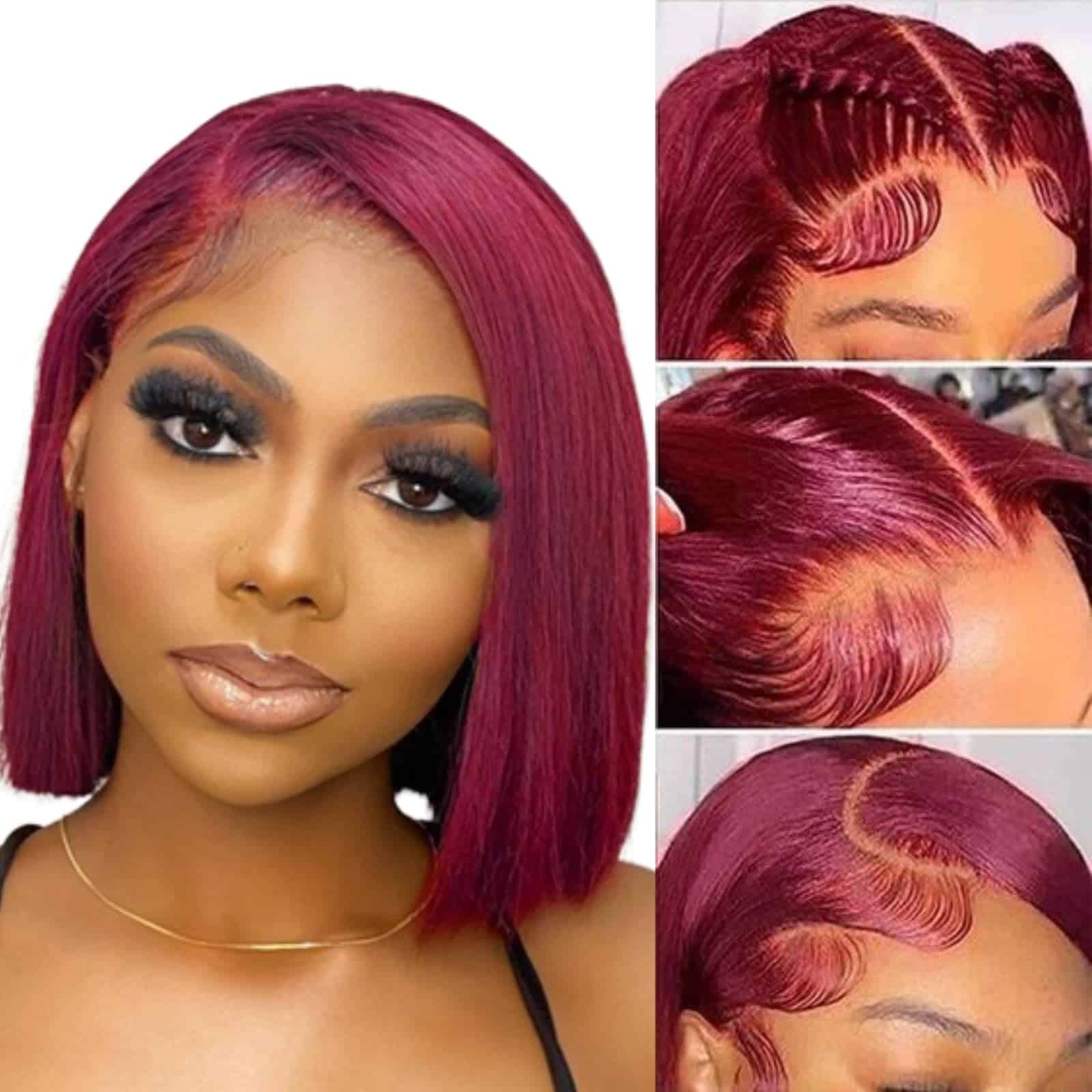 1. Material de peluca de cabello humano Bob 99j: 100% pelucas de cabello humano bob de encaje corto sin procesar 13×4, pelo liso brasileño, sin químicos u otros cabellos involucrados, suaves, saludables y suaves. Suave y sedoso, completo y grueso, cómodo de usar.