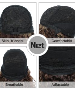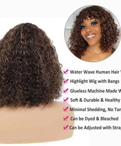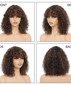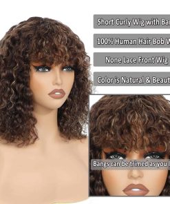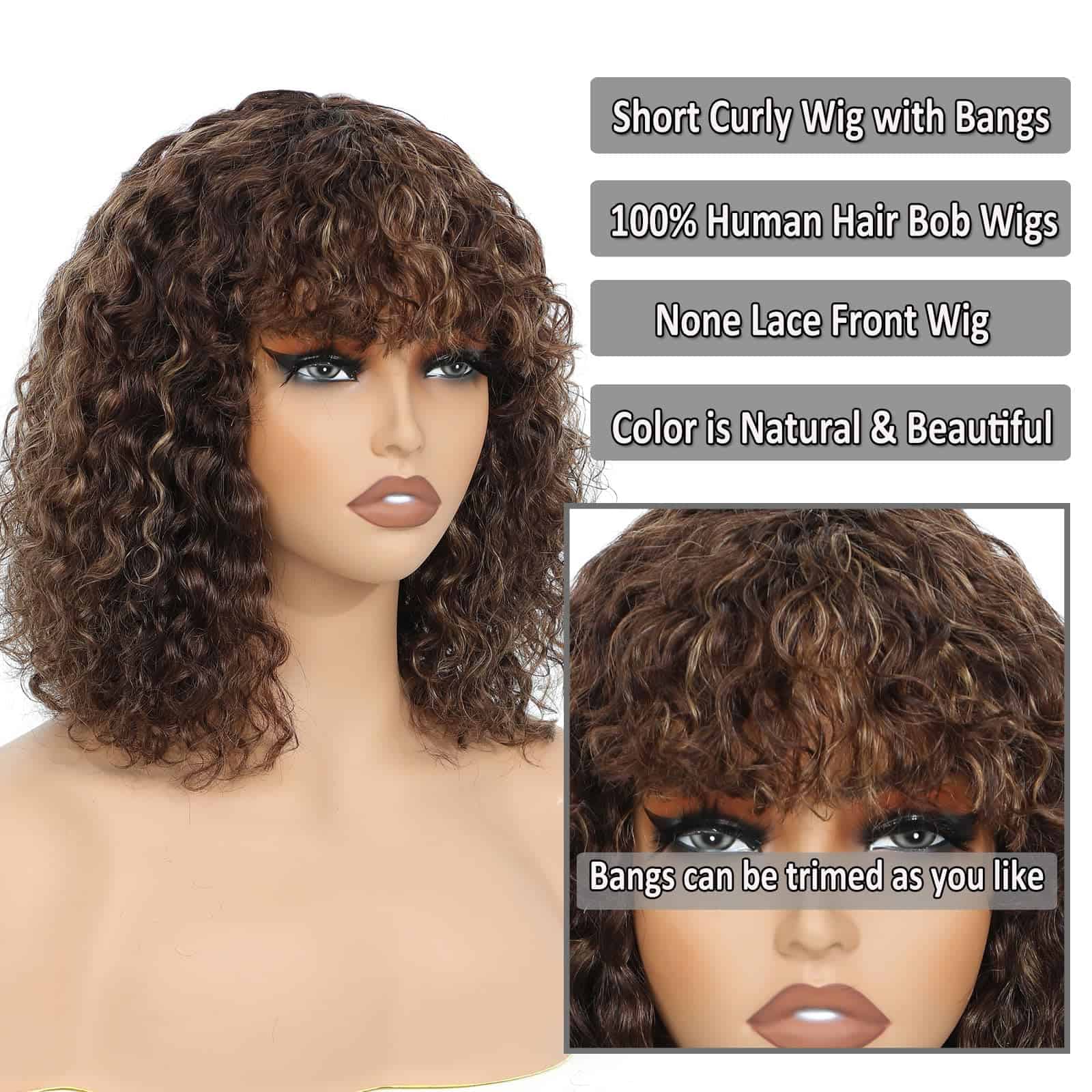 1. Tipo de peluca de cabello humano rizado corto con reflejos: Peluca rizada con flequillo de cabello humano, pelucas con cierres sin encaje, peluca rizada corta con flequillo para mujeres negras, peluca bob rizada con flequillo, peluca de cabello humano ondulado con reflejos rubios.