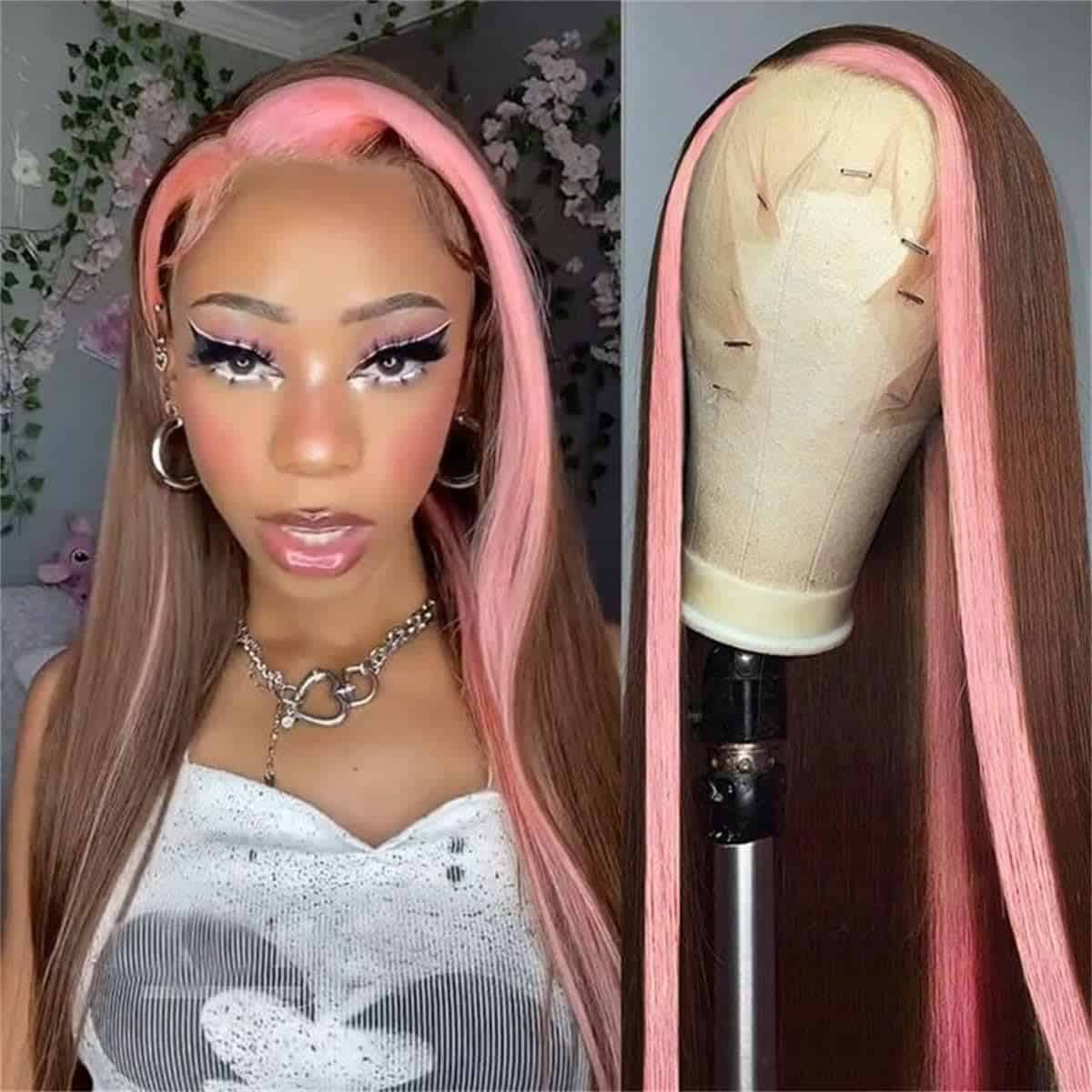 Color de cabello: Peluca de encaje marrón con rayas rosas