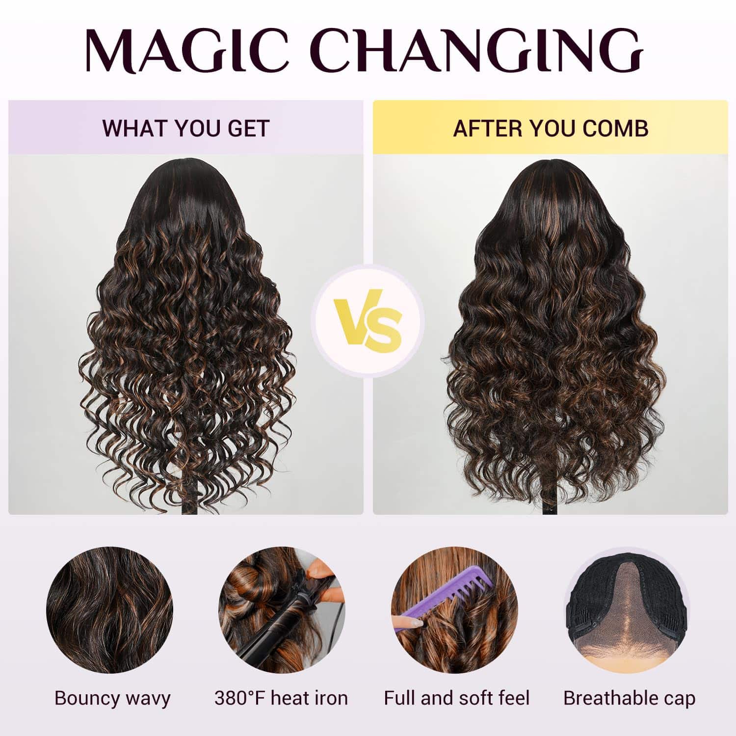 1. Peluca de Onda Cuerpo Sin Pegamento: encaje pre cortado, fácil de poner y listo para usar, ideal para principiantes, se instala en 3 segundos y se quita en 1 segundo, muy fácil de manejar esta peluca de encaje ondulada y suelta. Encaje HD, invisible y suave, las pelucas sin pegamento básicamente no requieren ningún procedimiento, solo se integran perfectamente con un poco de base, parece que crece desde su cuero cabelludo.