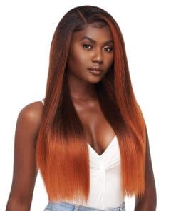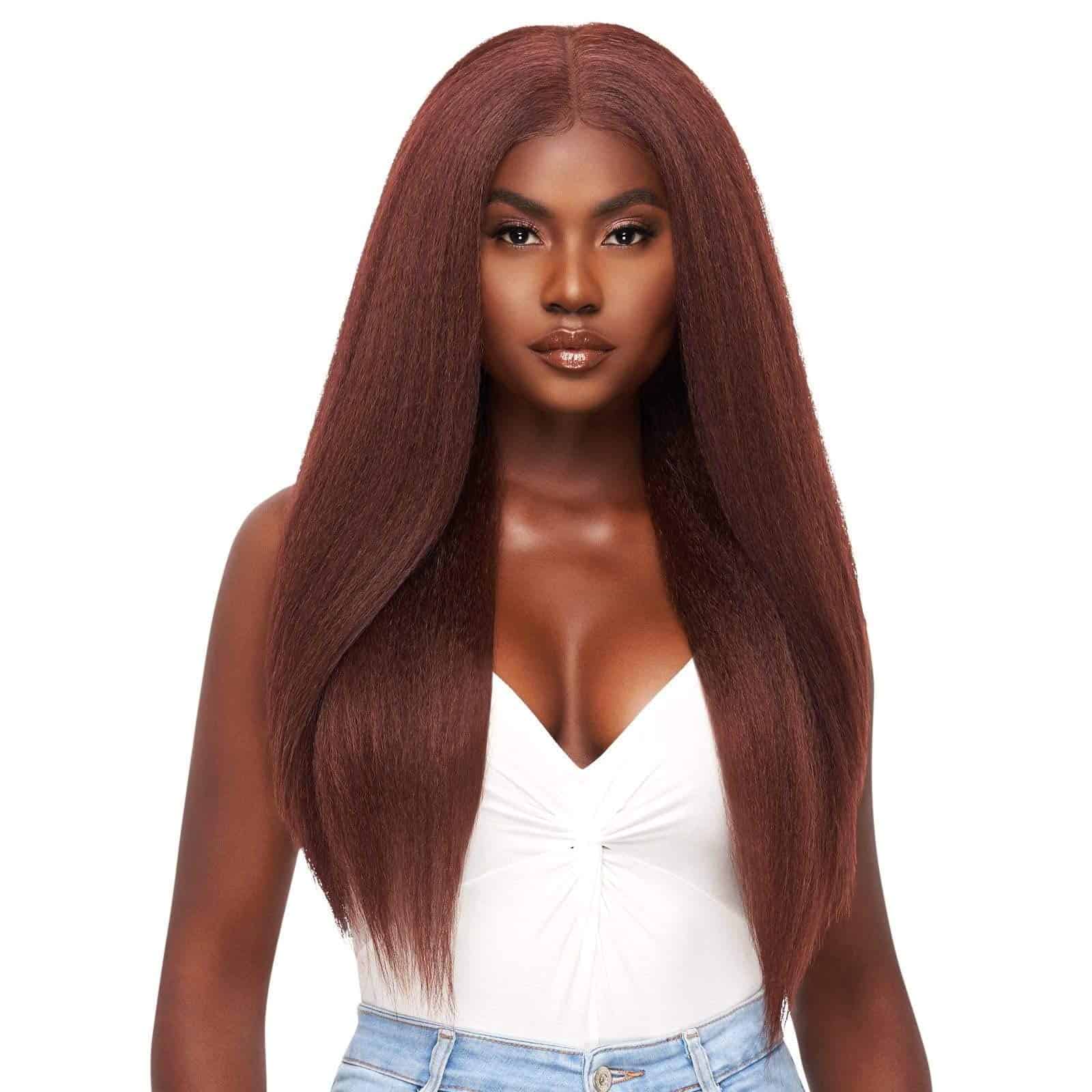 Outre Perfect Hair Line Synthetic 13×6 Faux Scalp Lace Front Wig – KATYA (HAVBRN). Color mostrado: DRFF Cajun Spice, DRFF Golden Amber, Havana Brown. Felpa sintética con encaje frontal de 13″ x 6″ completamente hecho a mano, encaje transparente HD, NO SE REQUIERE DESPLUMAR. Banda elástica ancha ajustable. Compatible con estilizado con calor.