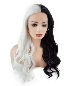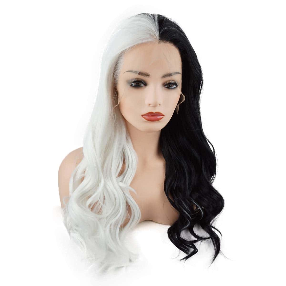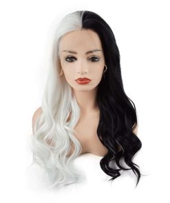 Diseño elegante con fotos reales de la peluca, color mitad negro y mitad blanco, longitud de 24 pulgadas, densidad del cabello del 150%, fibra resistente al calor, tamaño medio ajustable con correas, tres peines interiores para mayor seguridad, encaje frontal cosido a mano para un aspecto natural, suave y sedoso como cabello humano, sin enredos ni caídas. Recordatorio: puede haber ligeras variaciones de color debido a la iluminación y la pantalla, para más información contáctenos.