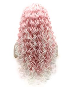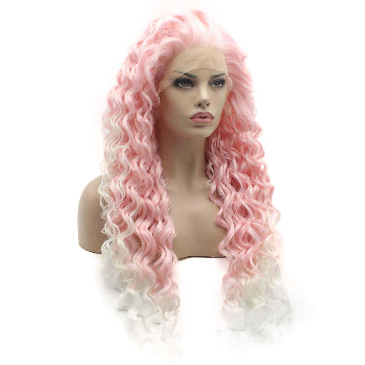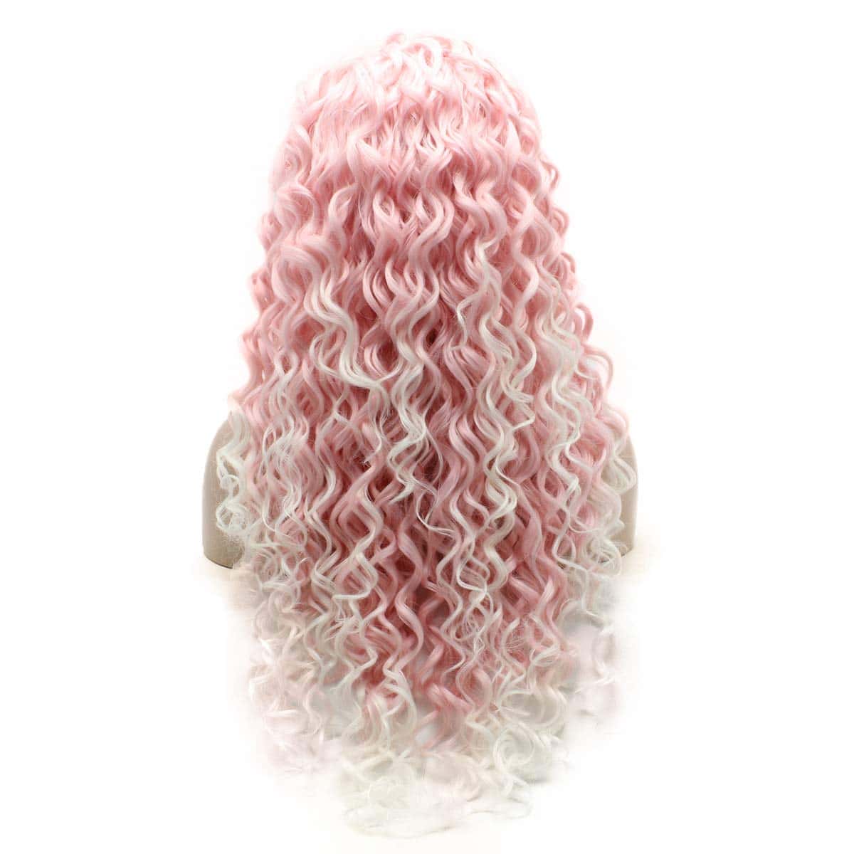 Pelucas rizadas rizadas, de 26 pulgadas, rosa con raíz blanca ombre, peluca frontal de encaje. Completa, gruesa, de alta densidad. Medio encaje frontal atado a mano, estilo libre, puedes separarlo donde quieras. Fibra de alta calidad resistente al calor, puedes usar calor en ella para reestilizar. Sin enredos ni caídas, suave, sedoso.