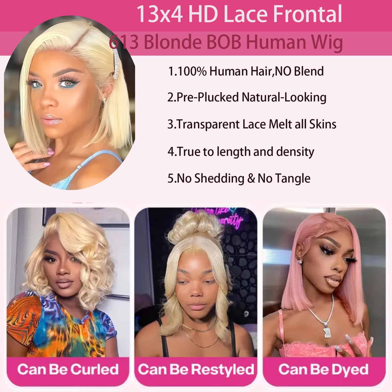 1. Material de Cabello Humano Rubia 613 Bob: 100% Cabello Humano Virgen Brasileño Sin Procesar, 200% de Densidad, Cortado directamente de la cabeza de chicas jóvenes, Completo y Grueso, Suave y Cómodo, Natural y Saludable. Puede ser Teñido, Decolorado y Restilado. Un Cuidado Cuidadoso durará más de 12 meses.