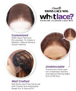 Marca: Sensationnel What lace Peluca Sintética Cloud9 sin pegamento con banda elástica 13×6 lace frontal preconfeccionada línea de cabello HD. Free parting 13 x 6 lace frontal extra ancho con preplucked natural density hairline con babyhair. Cabello sintético con alta resistencia al calor y área delantera de encaje swiss HD atada a mano. Tamaño de cabeza pequeña a grande amigable debido al área de free part con encaje HD transparente de oreja a oreja, peines metálicos, correas ajustables. Fácil peluca DIY sin pegamento con opciones de estilo de longitud de cabello corto o largo y opciones de colores básicos y especiales de balayage, flamboyage y aspectos destacados de moneypiece.