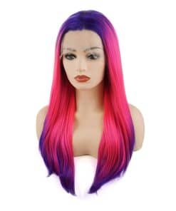 Pelucas de encaje frontal sintético recto largo de 24 pulgadas en degradado de púrpura raíz roja rosa. Fibra resistente al calor de alta densidad sin enredos ni caídas. Realista y suave.