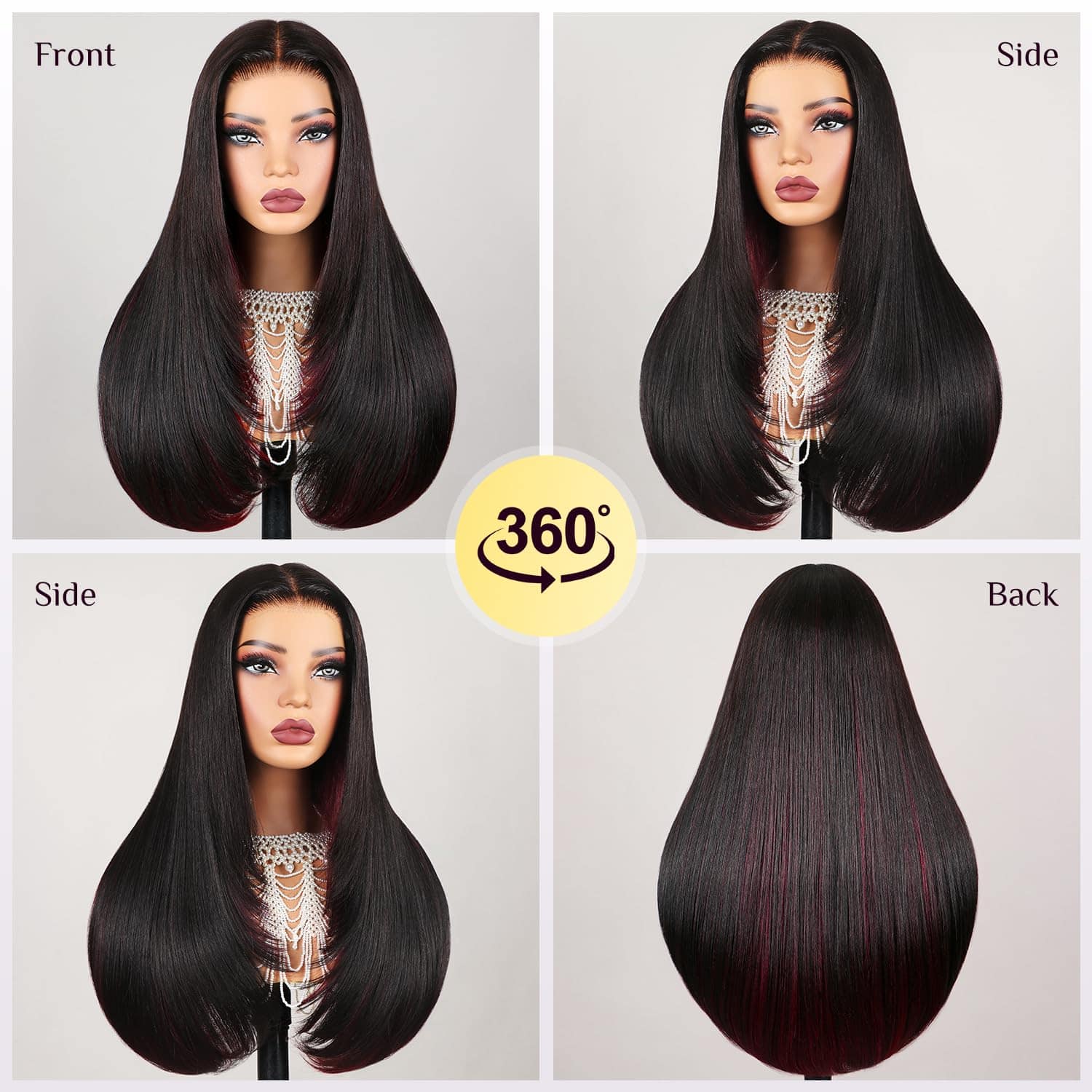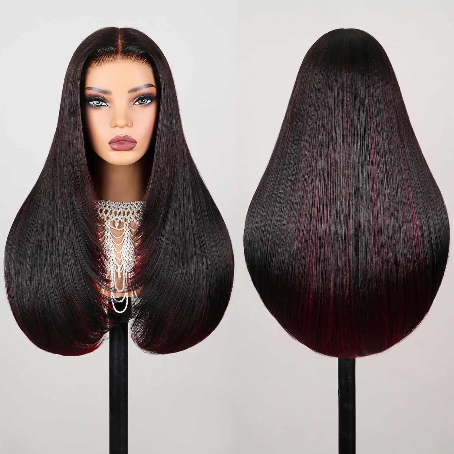Pelucas TESLAL Borgoña Mezclado Negro Glueless están diseñadas para ser fáciles de usar e instalar en solo 3 segundos. La mezcla de cabello humano con fibra premium proporciona un aspecto y tacto como el cabello humano real. Con un estilo recto en capas que enmarca el rostro de manera única y favorecedora, esta peluca es adecuada para cualquier ocasión. La tapa de encaje en forma de T de 6x6x1 proporciona una apariencia natural con un encaje HD que se adapta perfectamente a la piel. La tapa de peluca 5D nueva está diseñada para ser transpirable, ajustable y cómoda de llevar, sin necesidad de pegamento ni gel. Con un color de resalte y una densidad del 260%, esta peluca se ve lujosa y moderna. ¡Anímate a probarla hoy mismo!