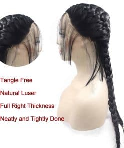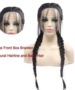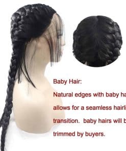 Material: 100% fibra de alta calidad. Color: Negro. Longitud: 22 pulgadas. Tipo: Peluca sintética premium. Resistente al calor hasta 150c/302f. Tamaño del gorro: Circunferencia de 21.5-22 pulgadas. Adecuada para uso diario, Halloween, conciertos, fiestas temáticas, bodas, citas, etc. Cabello completo y natural con baby hair. Trenzas hechas de forma ordenada y firme. Peluca con encaje frontal que da un aspecto natural. Consejos de cuidado del cabello incluidos en la descripción.