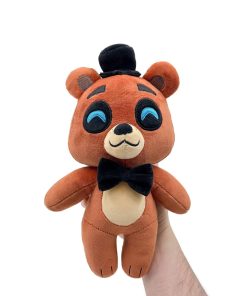 «El Peluche ¡Oh, te veo triste. ¿Quieres un abrazo? Con una altura de 9 pulgadas, Freddy debuta en su forma de peluche. Un sombrero de copa negro descansa en su cabeza entre sus orejas perfectamente redondas, mientras que una corbata negra clásica está ubicada debajo de su barbilla. La sonrisa más adorable cruza su hocico y sus ojos azules brillan felizmente desde sus cuencas negras. Sus brazos y piernas marrones flojos cuelgan de su simpático torso. Este peluche es de minky, hecho de 100% algodón PP súper suave y listo para abrazar!»