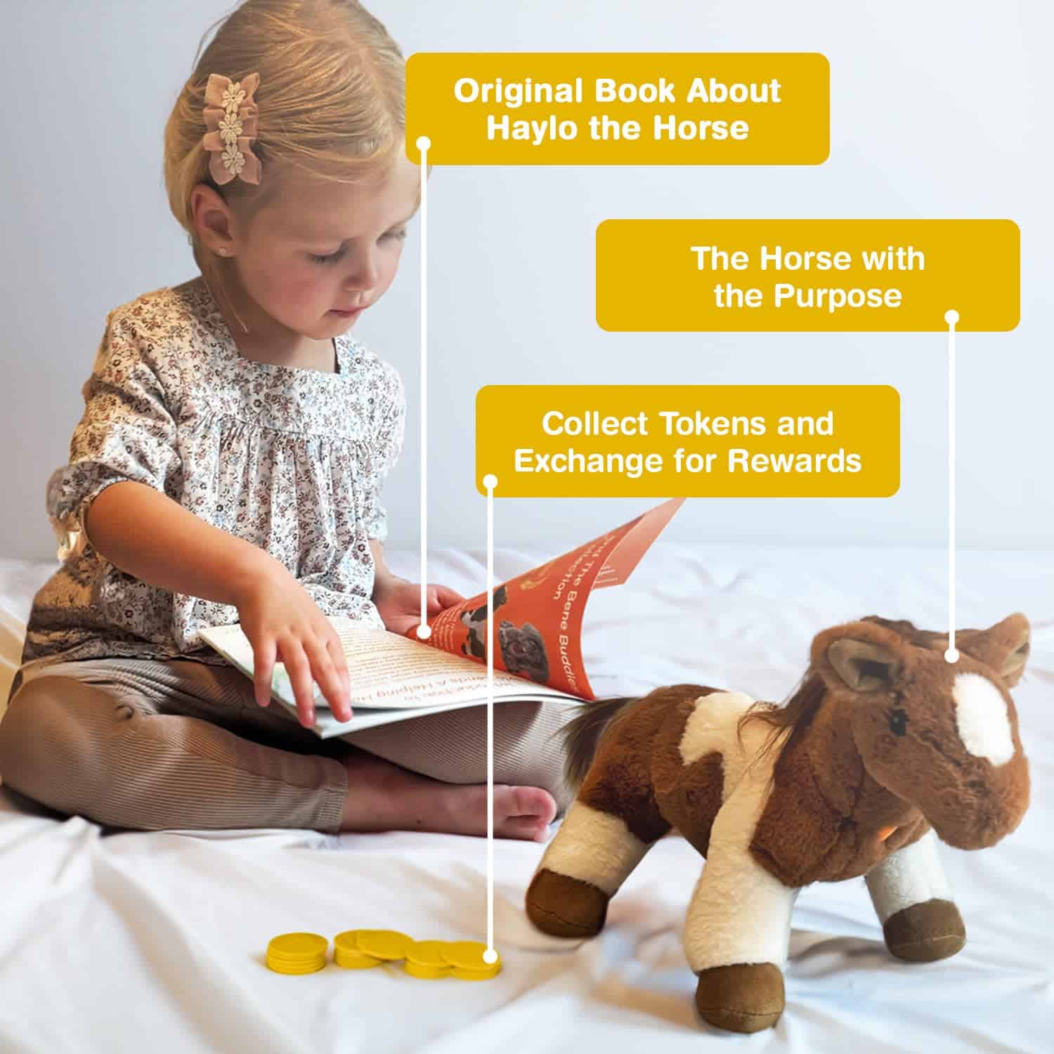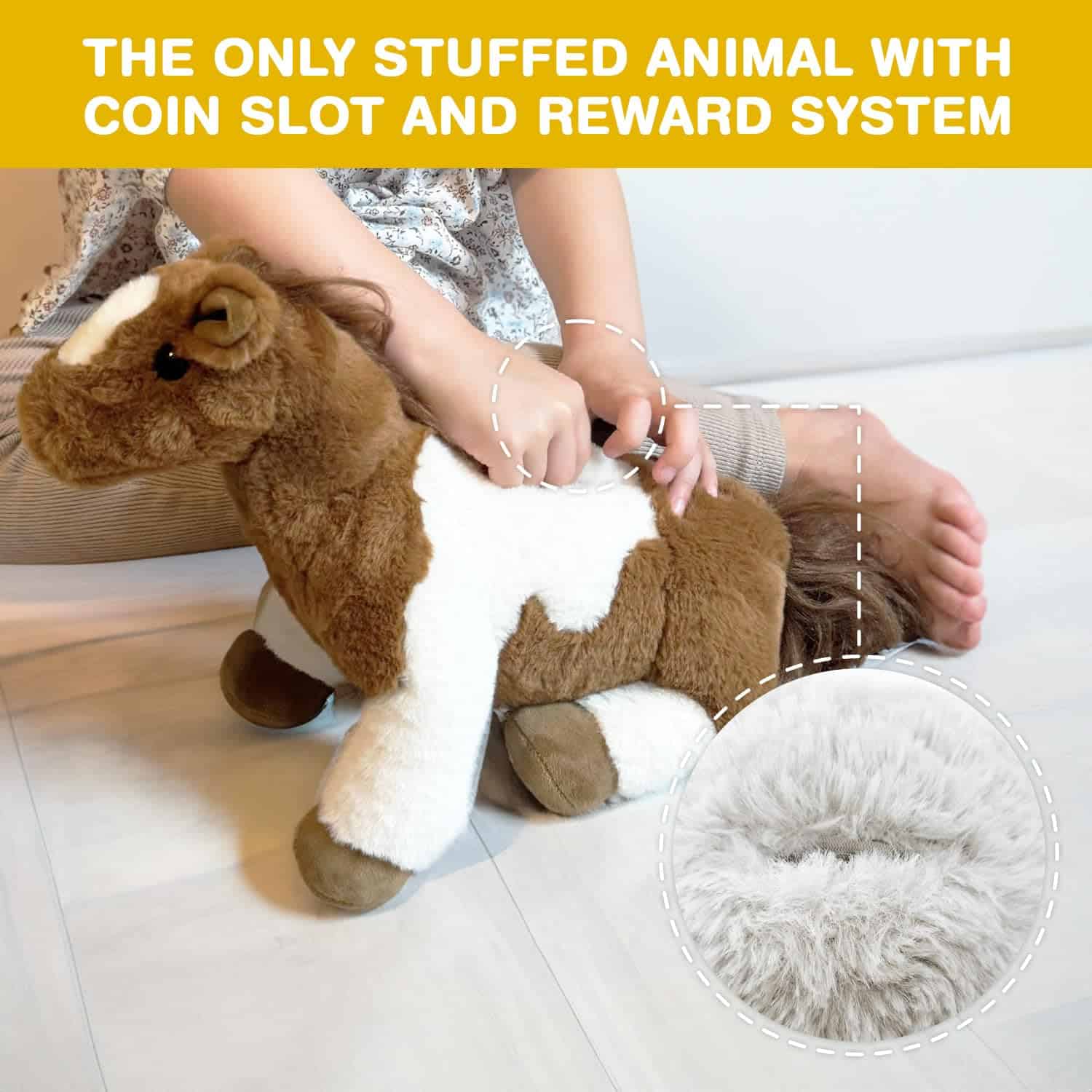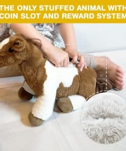 2. Peluche de caballo con un SISTEMA DE RECOMPENSAS: Este juguete de peluche de caballo viene con un sistema de recompensas único. Cuando los niños hacen una buena acción, ponen un token en el caballo, convirtiéndolo en uno de los peluches de caballo más educativos para niñas y niños.