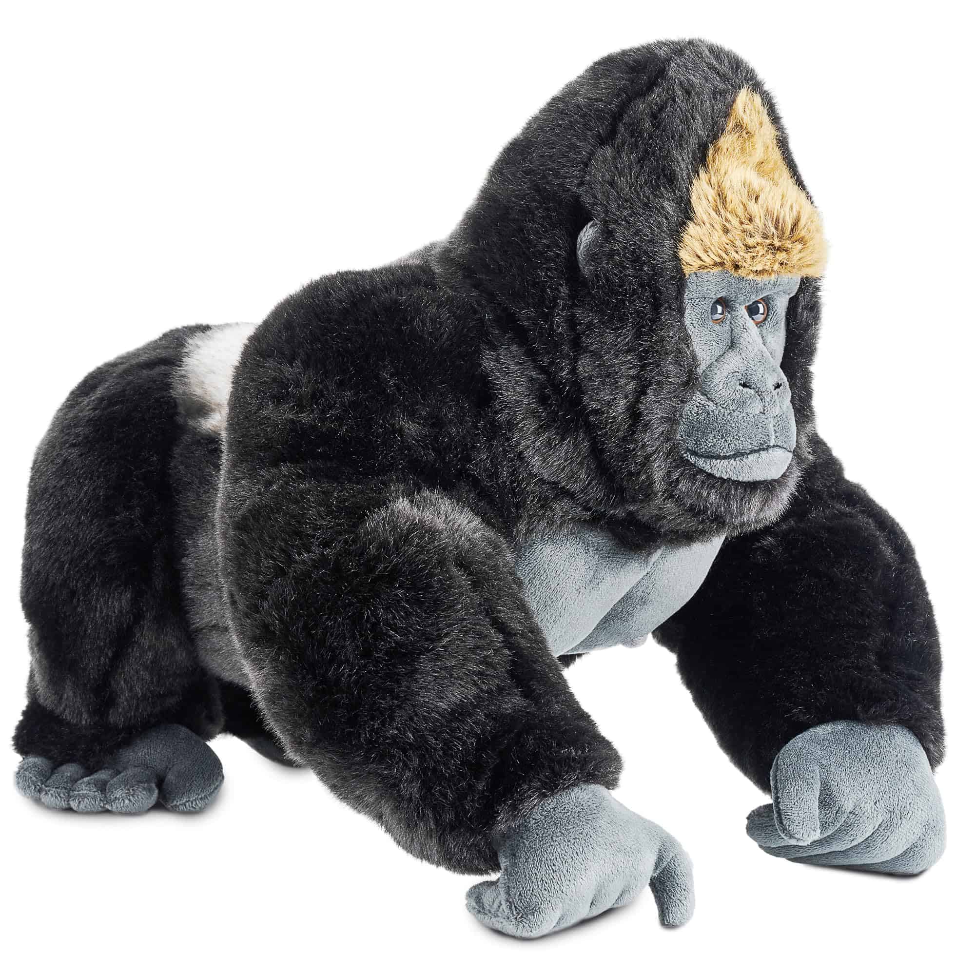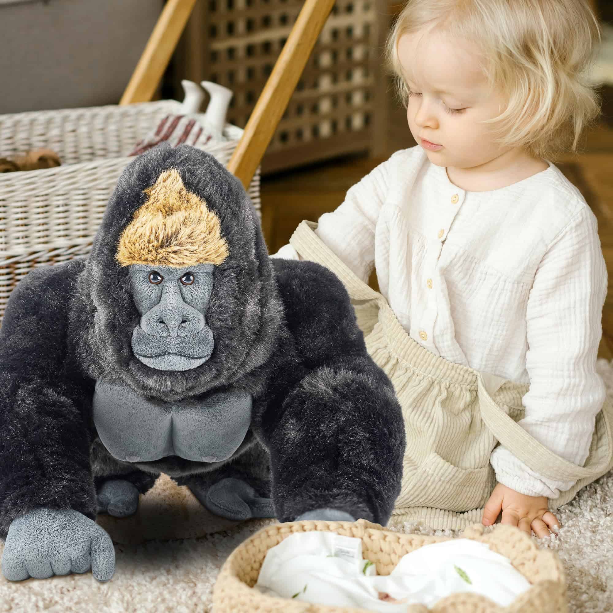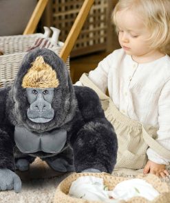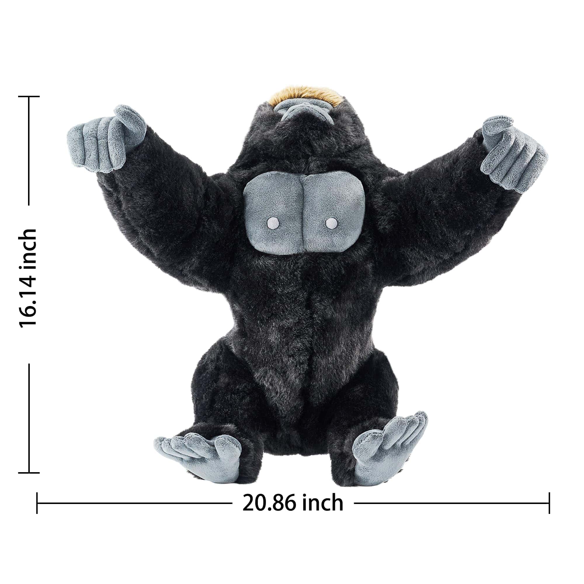 3. Dimensiones: Gran juguete de peluche de gorila. 16″(altura)/20″(longitud total).