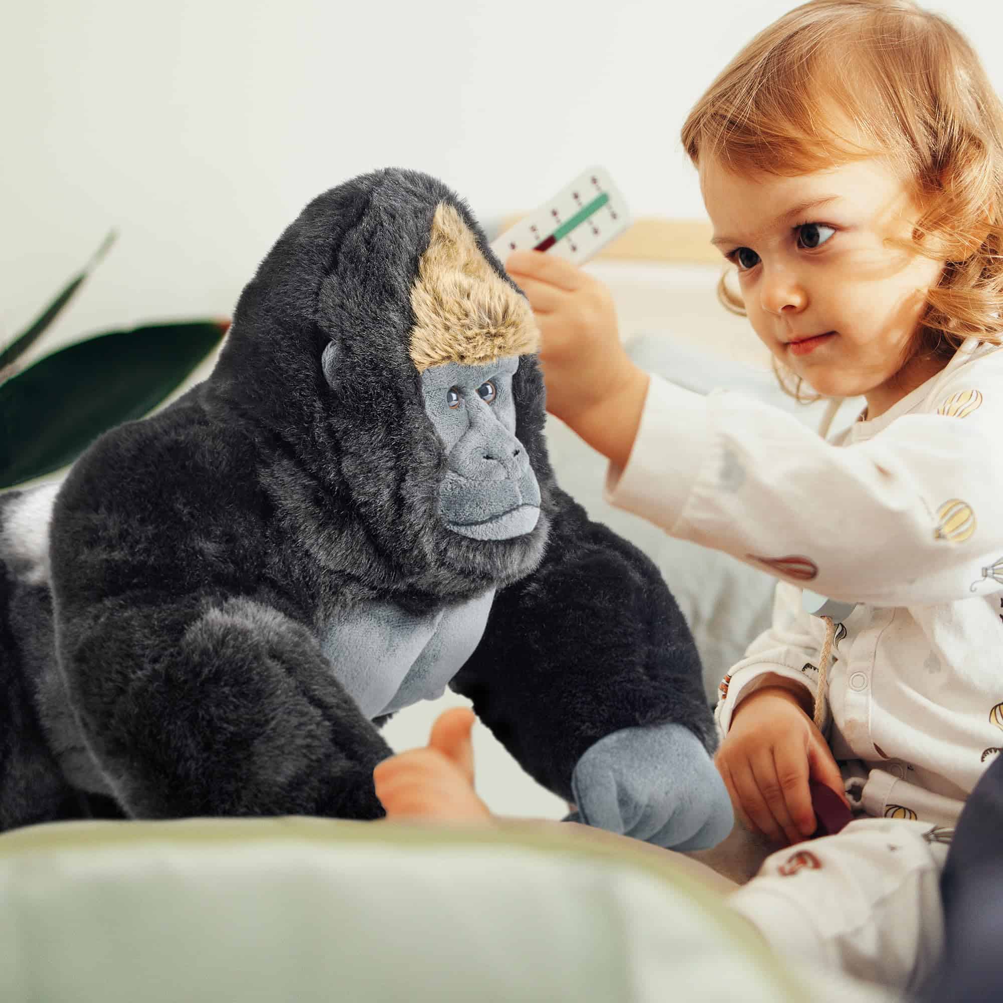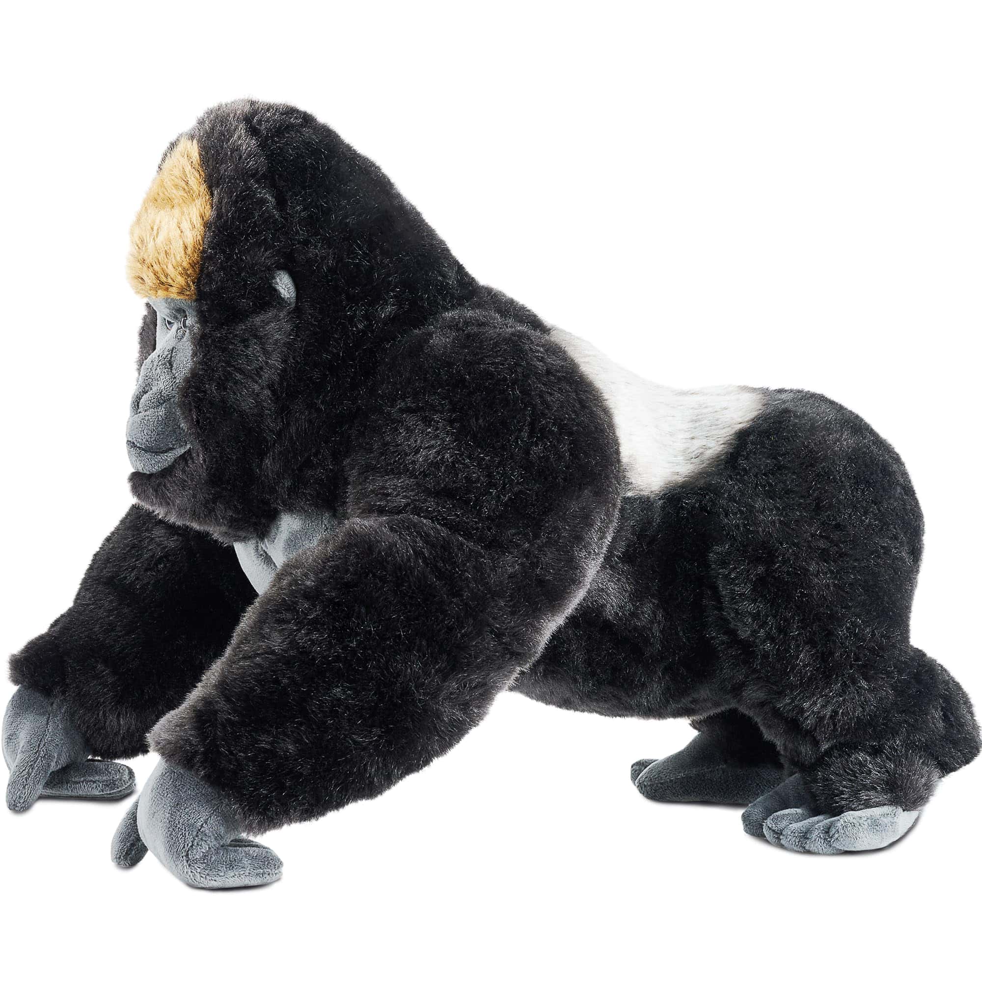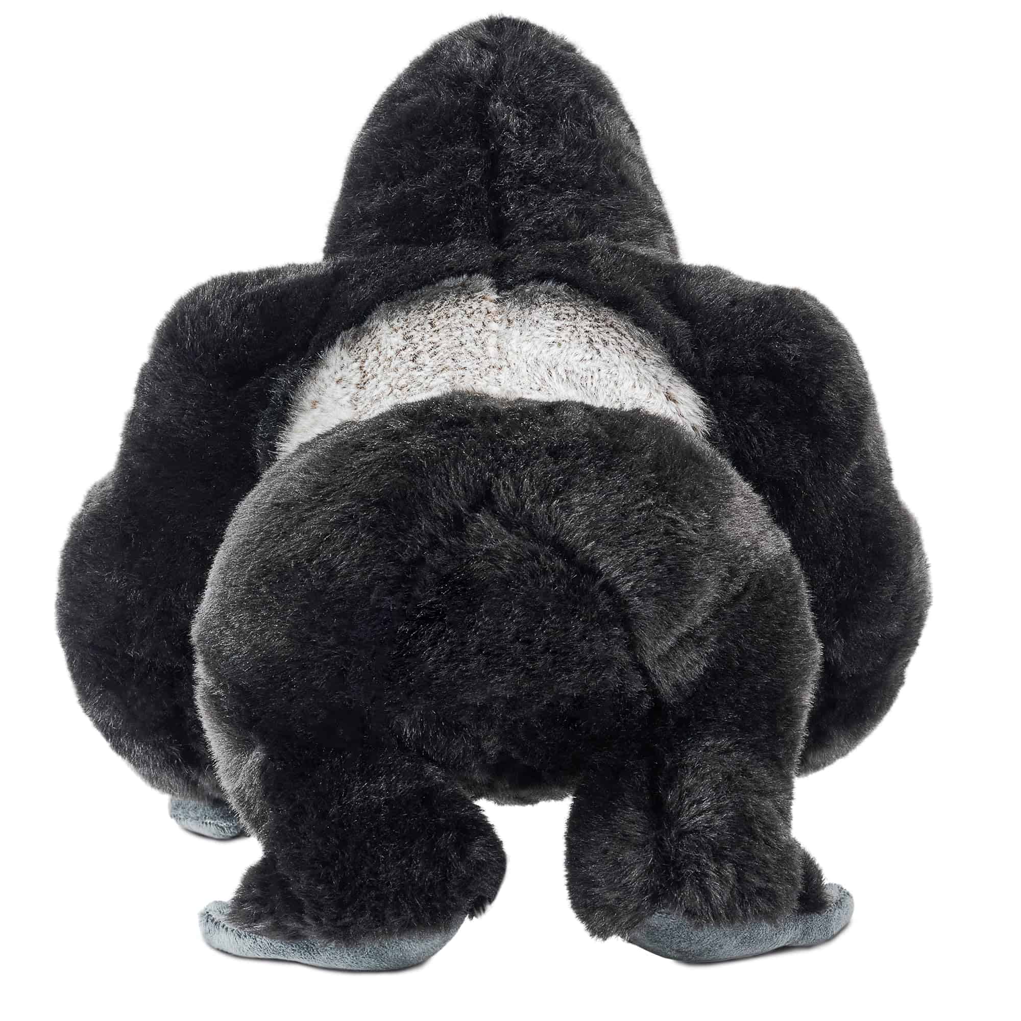 3. Dimensiones: Gran juguete de peluche de gorila. 16″(altura)/20″(longitud total).