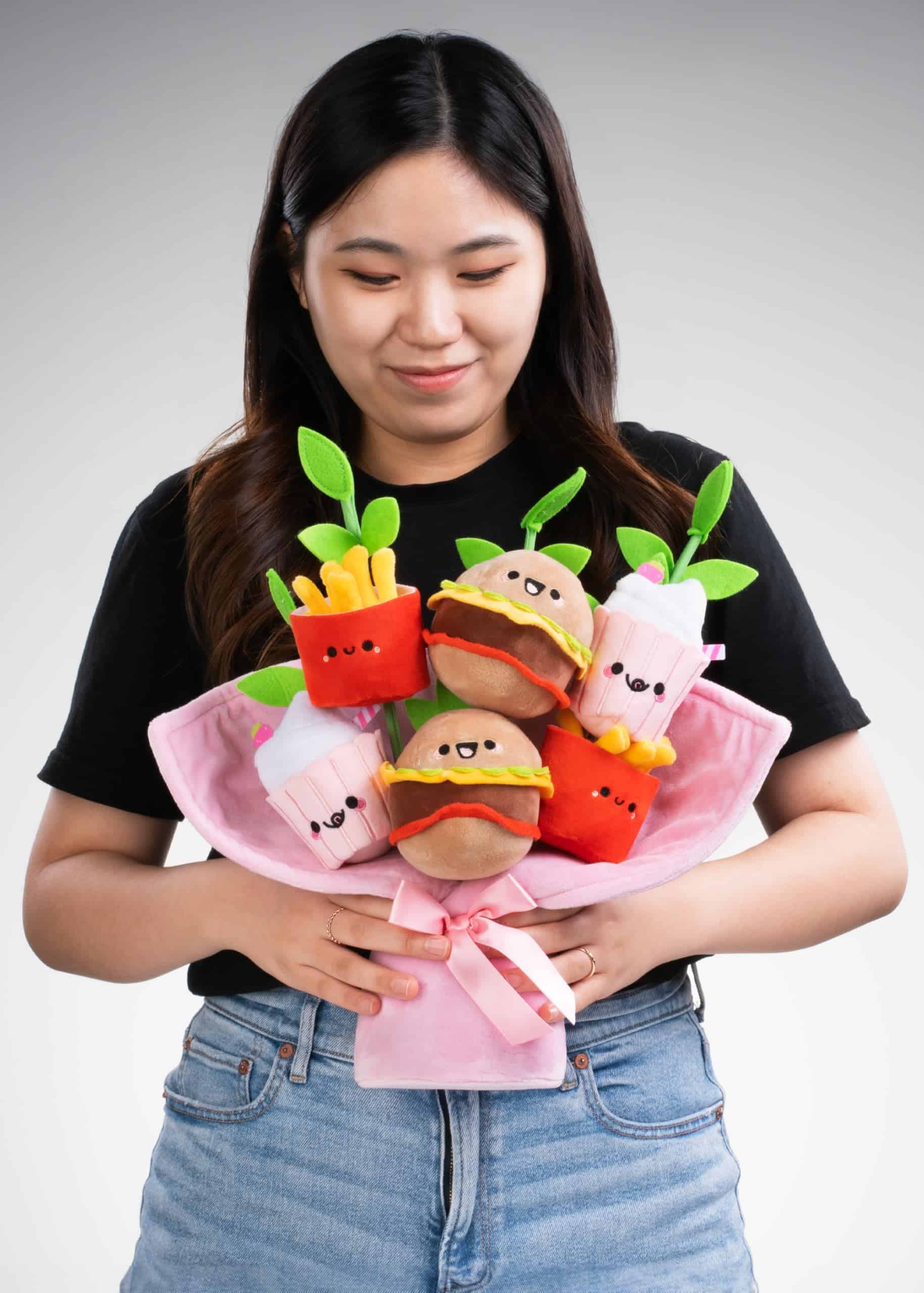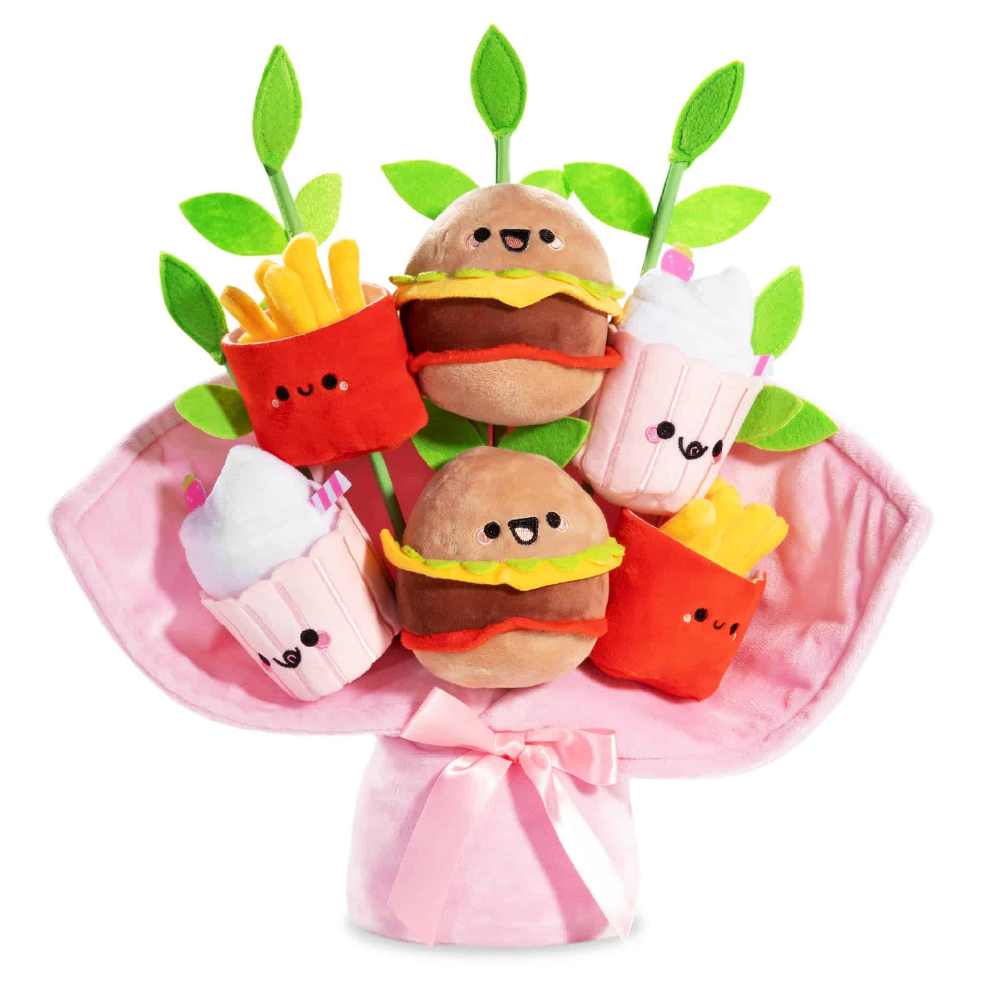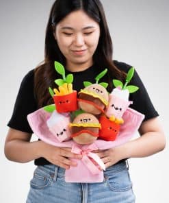 ¡Dale a tu aficionado favorito de la comida rápida un regalo inolvidable con nuestro Peluche de Ramo Fast Foodies de Smoko! Adorables hamburguesas kawaii, papas fritas y un batido están rodeados de hojas de fieltro y envueltos en un suave papel de peluche que está atado con un lazo de satén. Cada peluche adorable presenta detalles dimensionales y bordados que son demasiado lindos para palabras. ¿Por qué regalar flores comunes cuando puedes regalar un ramo que nunca muere?