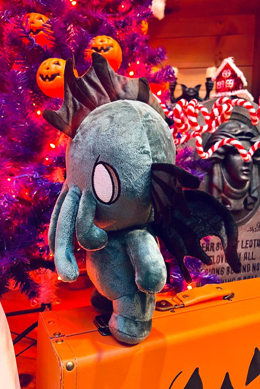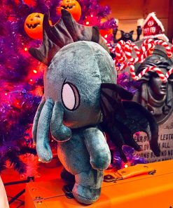 Criatura del caos Peluche del bebé Cthulhu. Tentáculos en tono aqua. Aletas rayadas. Alas articuladas posables. Borda con amor. Suave y espeluznante. Etiqueta de marca de VampireFreaks. 14″ de altura. Envergadura de 12″. Peluche 100% abrazable.