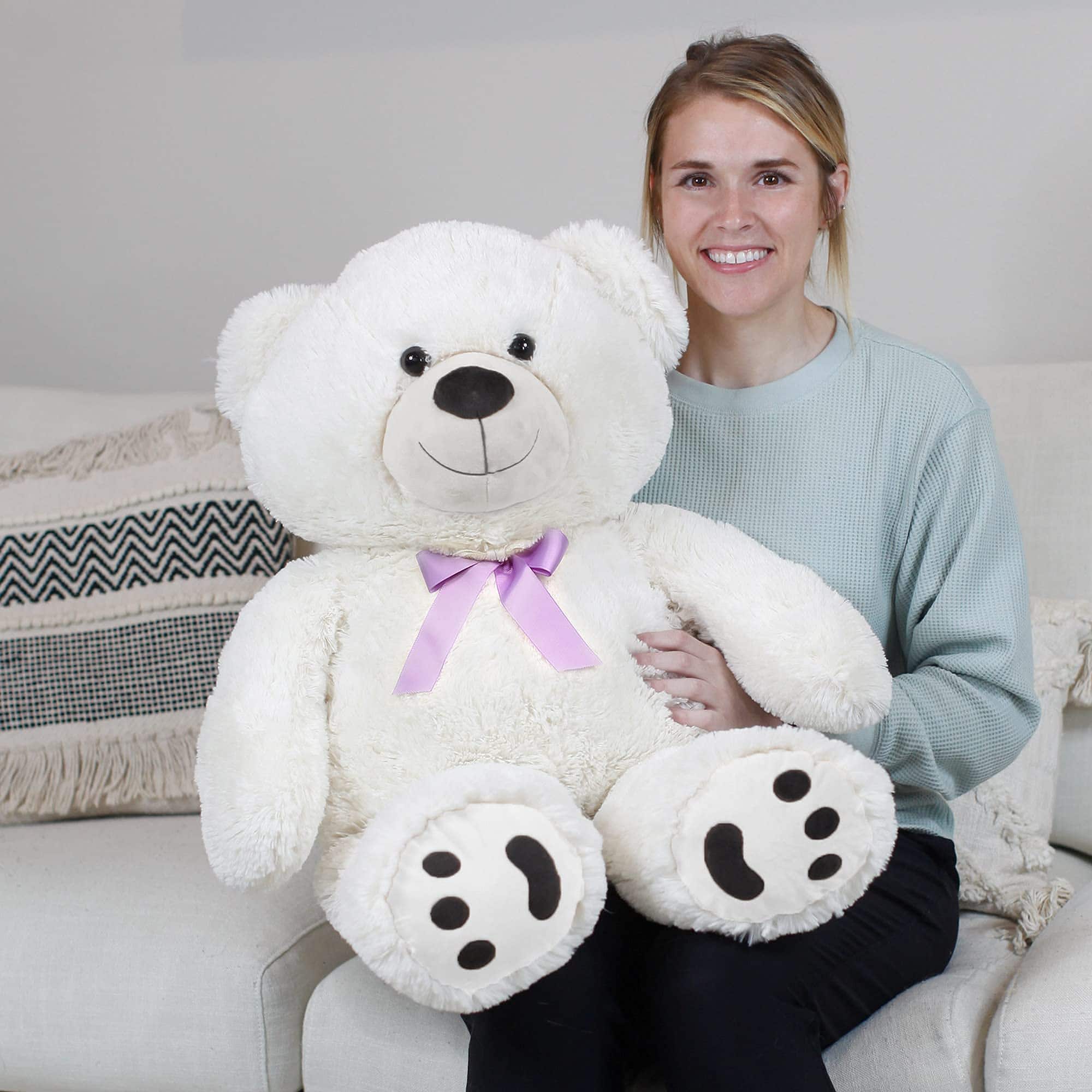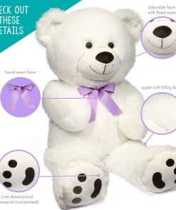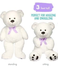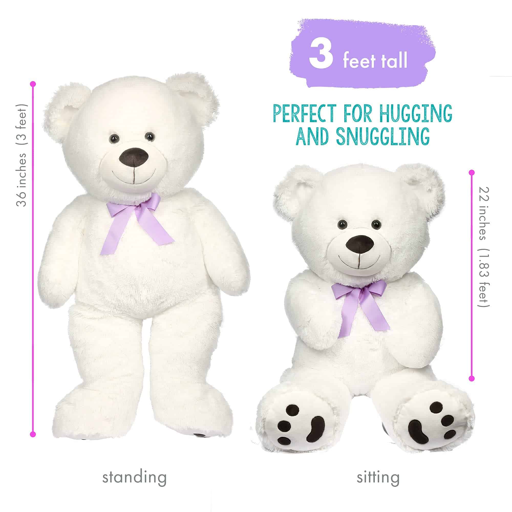 1. 36 pulgadas de alto: Nuestros peluches grandes de ositos de peluche miden 3 pies (36 pulgadas) de altura, desde las orejas hasta los pies; La altura sentada mide alrededor de dos pies (23 pulgadas); Lavable en superficie; Recomendado para edades de tres años en adelante.