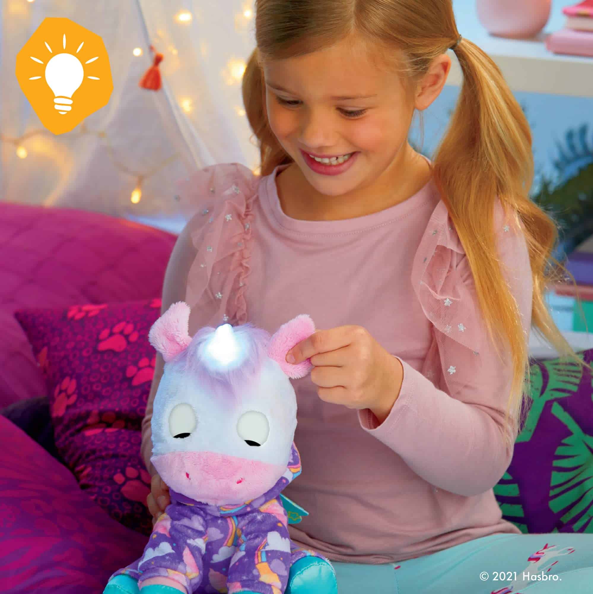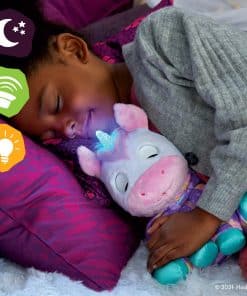 Alcanza al peluche interactivo de Unicornio FurReal Sweet Jammiecorn tanto de día como de noche. Es suave, mullido, y los niños de 4 años en adelante pueden demostrar cuánto les importa esta mascota de peluche. En modo día, aliméntala con el biberón incluido, y ella hará ruidos lindos al comer y sonidos juguetones. Lo que hace este juguete interactivo aún más adorable. Los niños pueden acurrucarse con ella a la hora de dormir también. Cuando llega la hora de apagar las luces, presiona su cuerno para cerrarle los ojos. El cuerno también cambiará de color de un alegre amarillo durante el día a un calmante azul durante la noche. Si los niños quieren escuchar canciones de cuna o paisajes sonoros de ruido blanco, solo tienen que presionar la oreja de la mascota en modo nocturno. Esta amiga de día y noche hace un regalo maravilloso y un amigo querido.