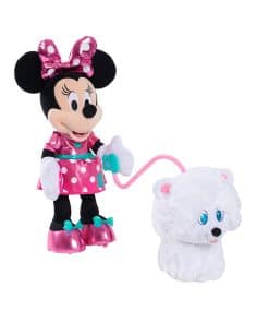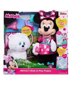 ¡Ningún trabajo es demasiado pequeño para las Felices Ayudantes de Disney Junior de Minnie! ¡Es un amor verdadero de perrito para Minnie Mouse mientras entrena y saca a pasear al dulce perrito Snowpuff! El Peluche Interactivo Minnie’s Walk and Play Puppy cuenta con dos modos de juego. Primero, usa el clicker de Minnie para enseñarle a Snowpuff a ladrar, girar y bailar. ¡Luego ve juntos en una aventura de paseo de perros! ¡Minnie canta y habla con su amigo peludo, y Snowpuff emite sonidos felices de perrito! ¡Edades recomendadas: 3+