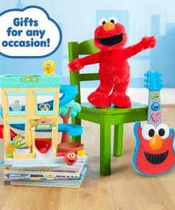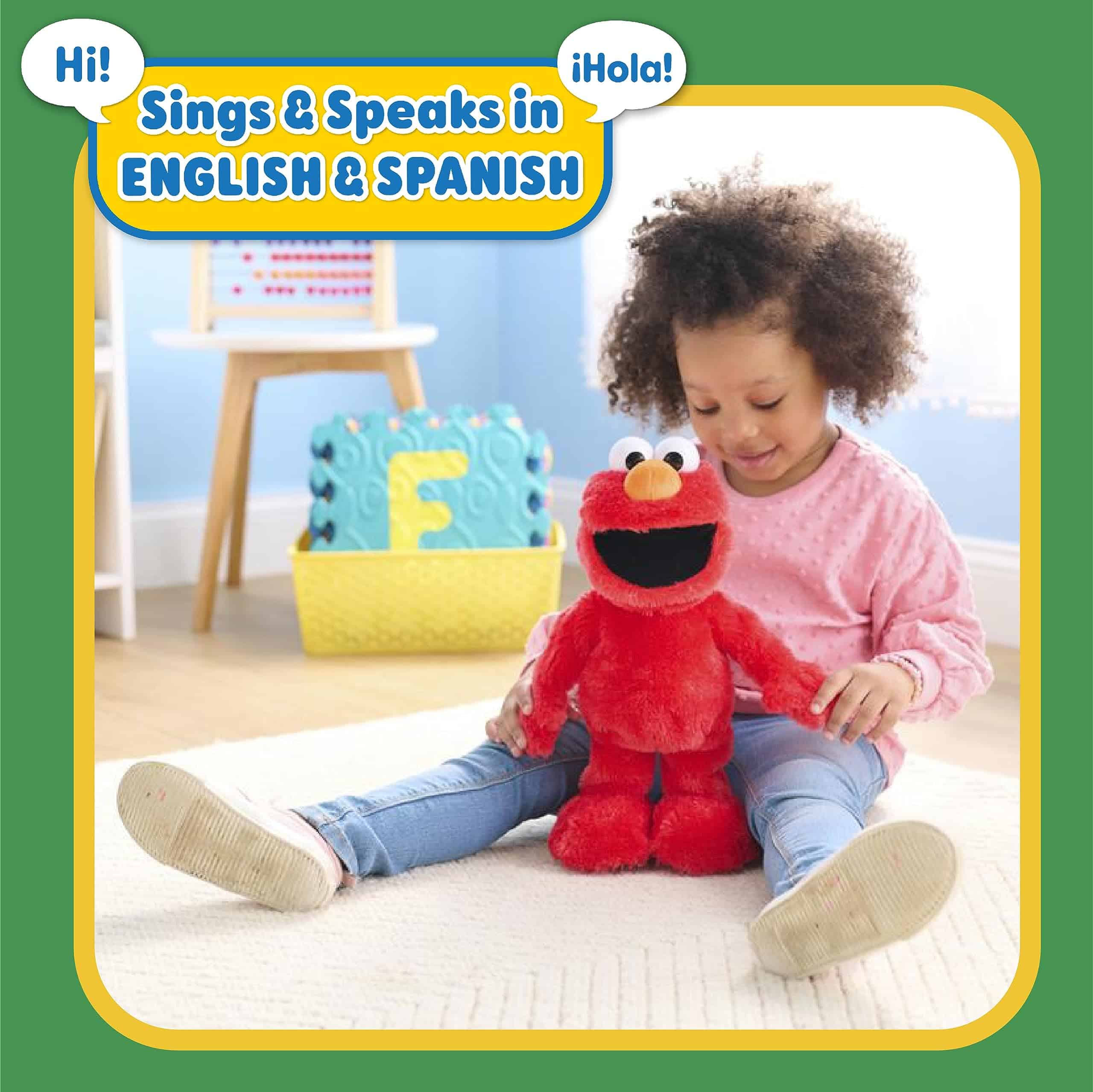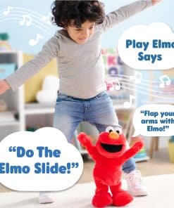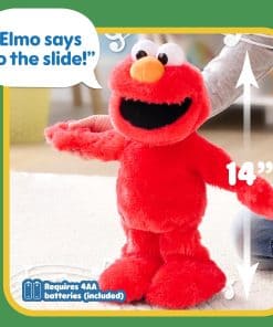 ¡Es hora de hacer el Elmo Slide! Con el juguete de peluche interactivo Sesame Street Elmo Slide, los pequeños pueden bailar, cantar y jugar con Elmo, en inglés o español. Aprieta la mano izquierda de Elmo para comenzar la música y el movimiento. Este peluche de Elmo de 14 pulgadas canta, se balancea, mueve los brazos y se desliza de un lado a otro al ritmo de la canción Elmo Slide. Es tan divertido que los niños y los adultos no podrán quedarse quietos cuando Elmo les anime a bailar con él. Aprieta la mano derecha de Elmo para jugar a «Elmo Dice». Al igual que el juego «Simón Dice», Elmo les dice a los niños que sigan sus instrucciones. ¡»Elmo dice levanta los brazos arriba!» El peluche de Elmo Slide está hecho de telas súper suaves y contiene relleno de poliéster reciclado al 100%. Las ruedas ocultas permiten que Elmo se deslice de un lado a otro en superficies lisas. ¡Divertido para jugar activamente! Este juguete preescolar es ideal para niños de 2 años en adelante. Requiere 4 pilas AA (incluidas). Sesame Street y los personajes, marcas comerciales y elementos de diseño asociados son propiedad y están licenciados por Sesame Workshop.