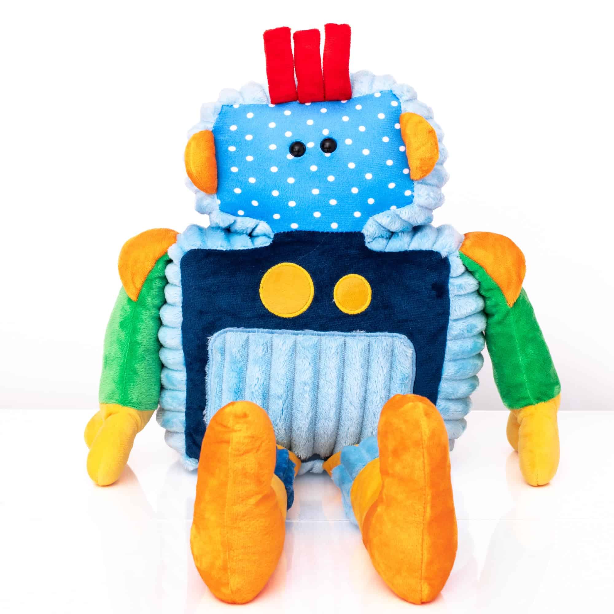 Hazte amigo de Robot. Este ultra suave y achuchable peluche de minky de Robot tiene 24″ de altura con brazos y piernas flexibles, ¡perfecto para jugar y abrazar! Robot es el compañero definitivo para la hora de jugar, dormir la siesta y dormir. Material premium de poliéster, 10″x 24″, diseñado para sentarse erguido, certificado de nacimiento personalizable, relleno de fibra hipoalergénica, costuras seguras con ojos de plástico, a prueba de juegos (lavable a máquina y secable en secadora). El Conjunto de Experiencia Definitiva de Robot de Peluche se vende por separado.