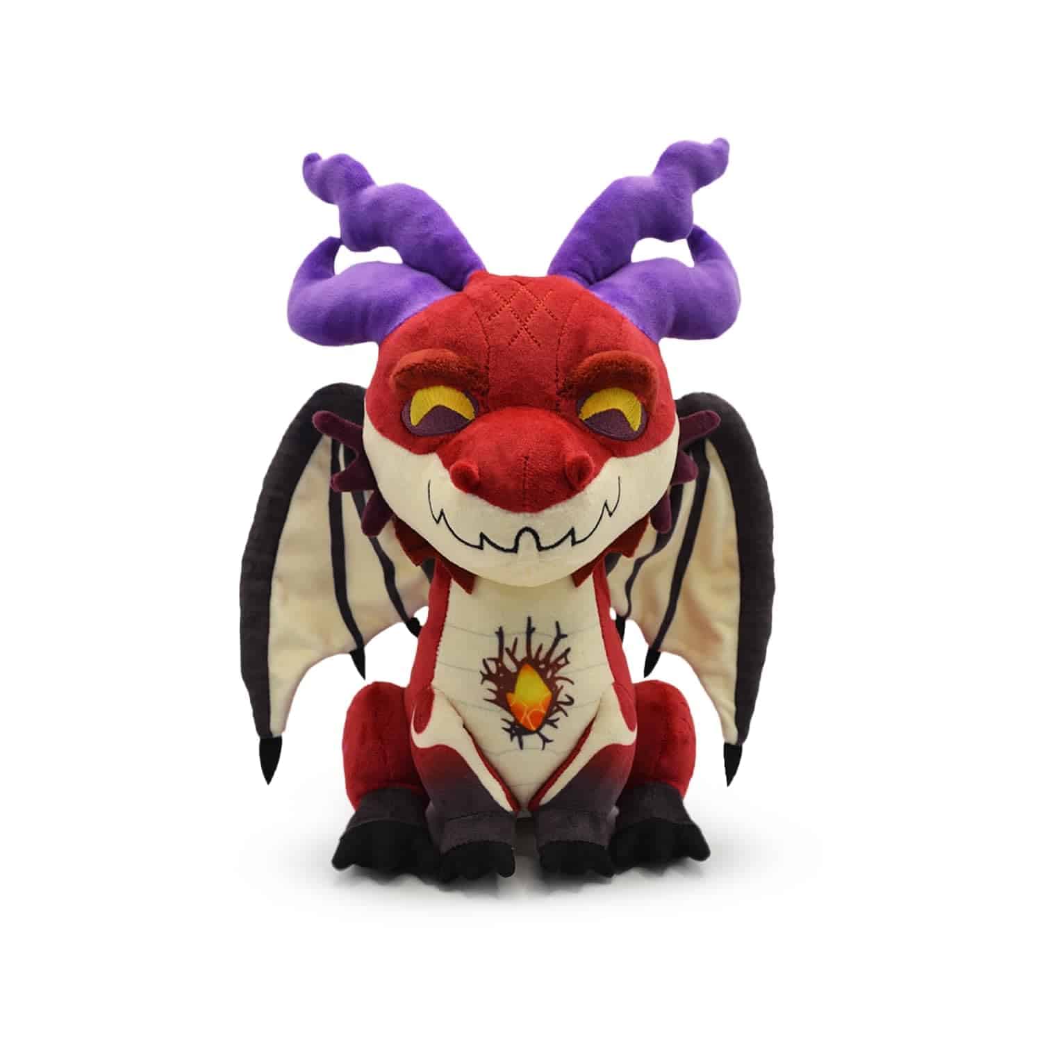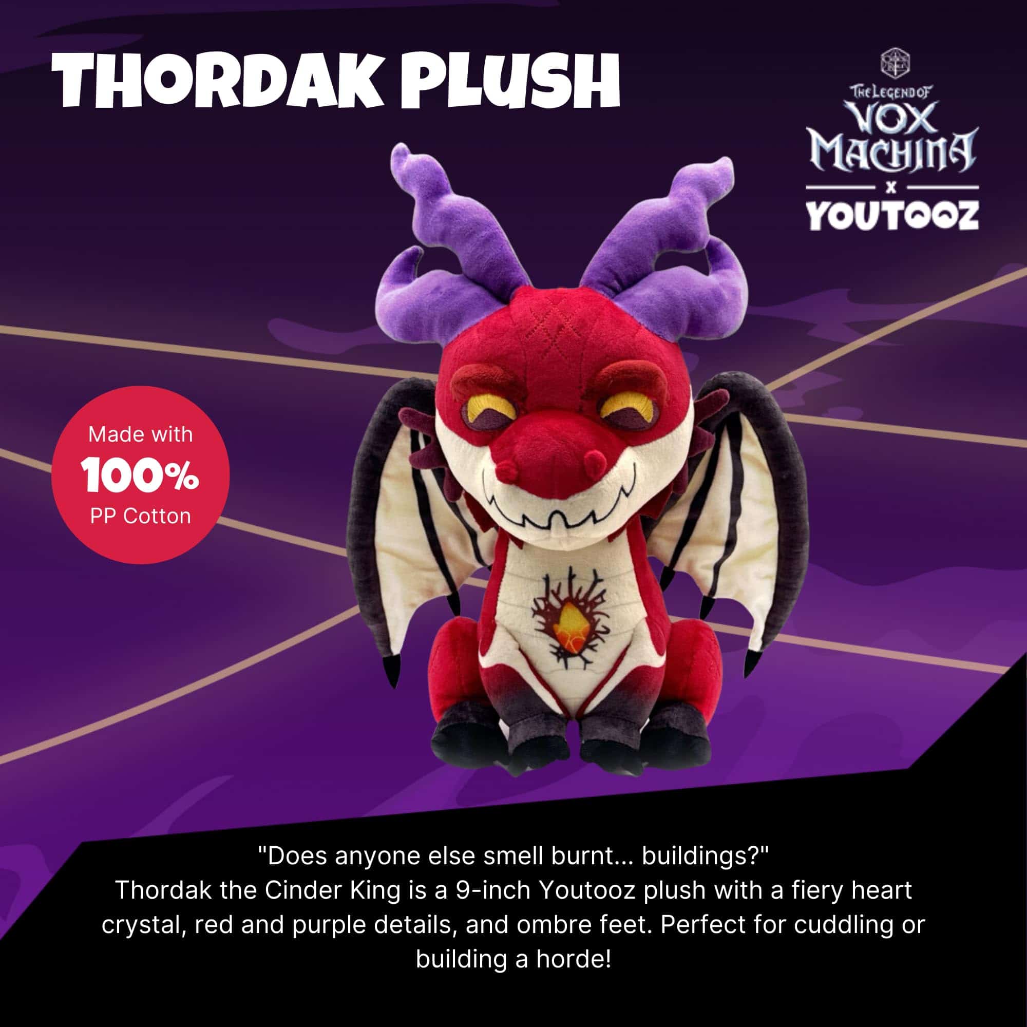 ¿Alguien más huele a edificios quemados? ¡Thordak, el Rey Ceniciento, se ha abierto paso siendo un suave peluche YouTooz! Este dragón de fuego se sienta amenazadoramente a 9 pulgadas de altura. Sentado adorablemente, en su parte trasera en llamas con sus patas delanteras en frente manteniéndolo erguido. Entre sus patas, en su pecho, se puede ver su cristal de corazón en llamas. Su cuerpo rojo se destaca con el uso de morado a lo largo de las líneas de sus alas, sus cuernos angulares y las espinas de su cola. Incluso sus pies van de morado a rojo degradado a medida que suben por sus pies. Mientras que su vientre y membrana alar son de un color beige claro. ¡Este peluche está repleto de algodón PP y está hecho de una mezcla de material de minky suave y material de minky sublimado, perfecto para abrazar o construir una horda con!