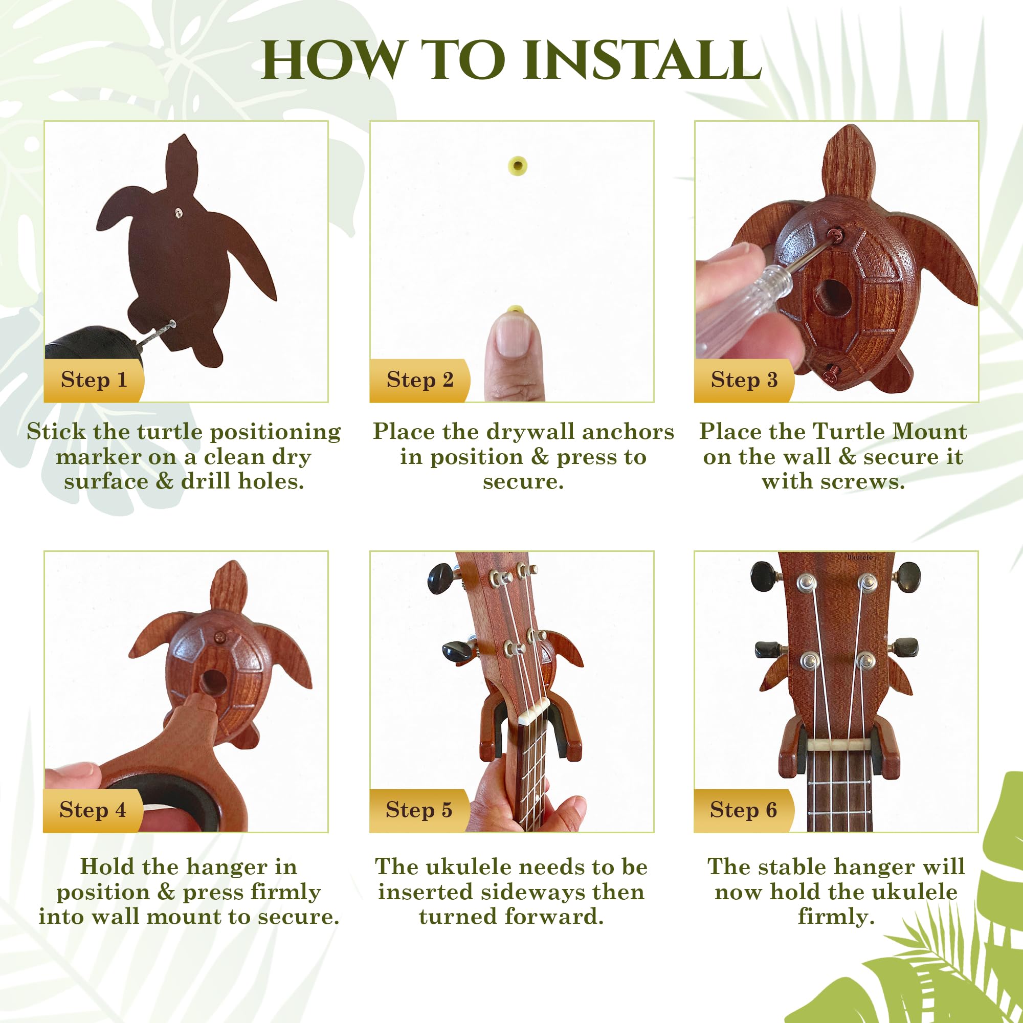 2. Diseño Único de Tortuga: Nuestro gancho de pared para ukulele presenta un diseño de tortuga que añadirá un toque de fantasía y encanto a cualquier habitación. El soporte para ukulele tiene un diseño de tortuga que es un símbolo de longevidad, sabiduría y buena suerte, convirtiendo este soporte para ukulele de pared en una decoración significativa e inspiradora para cualquier músico.