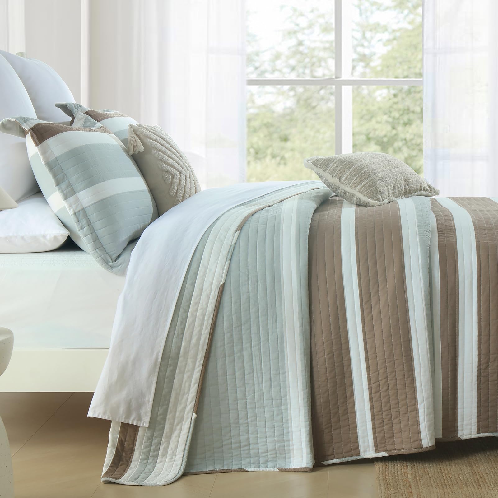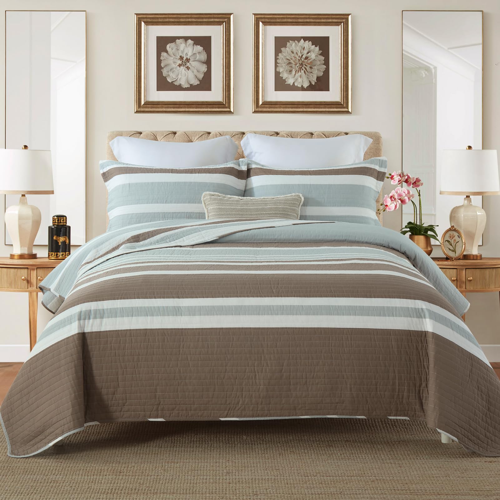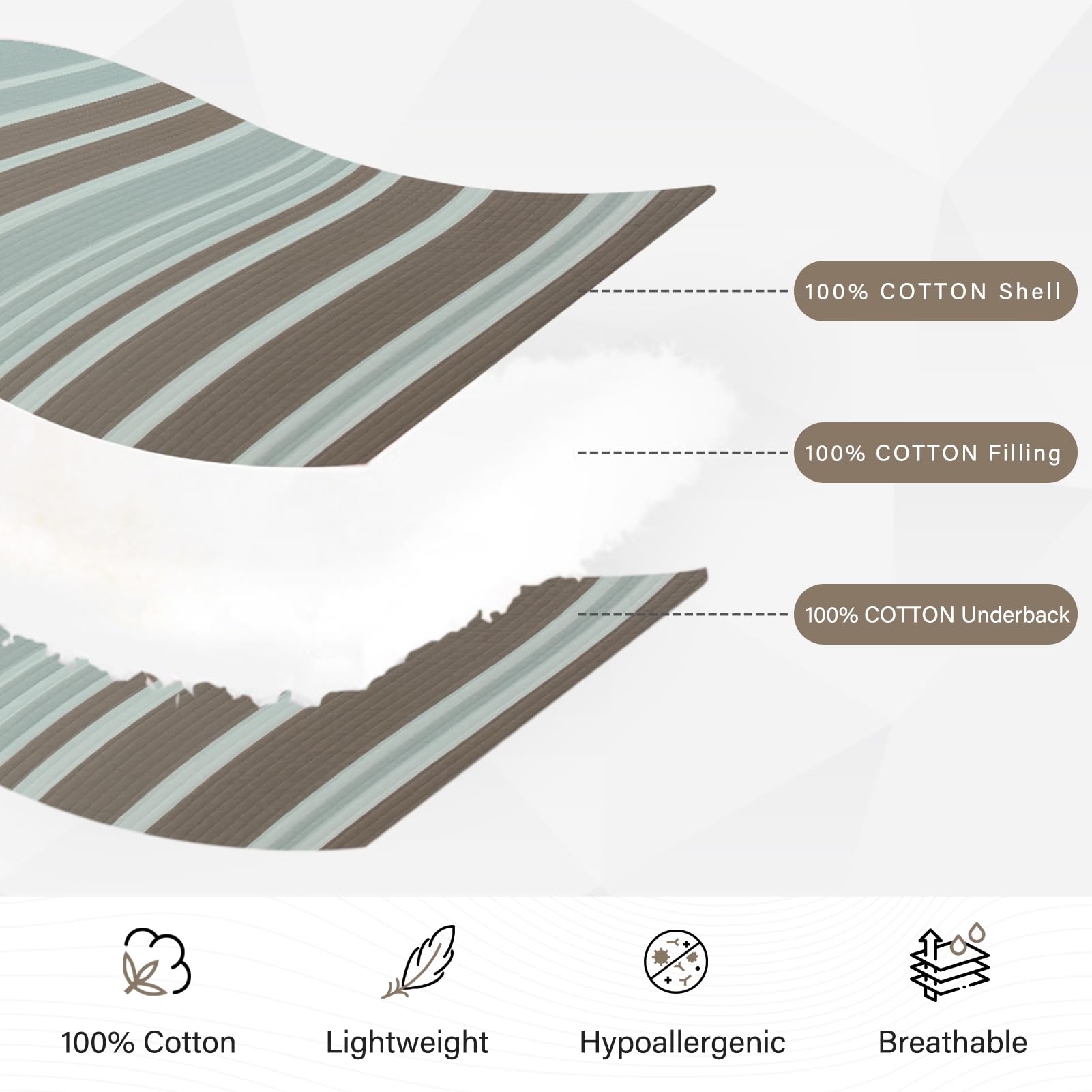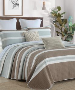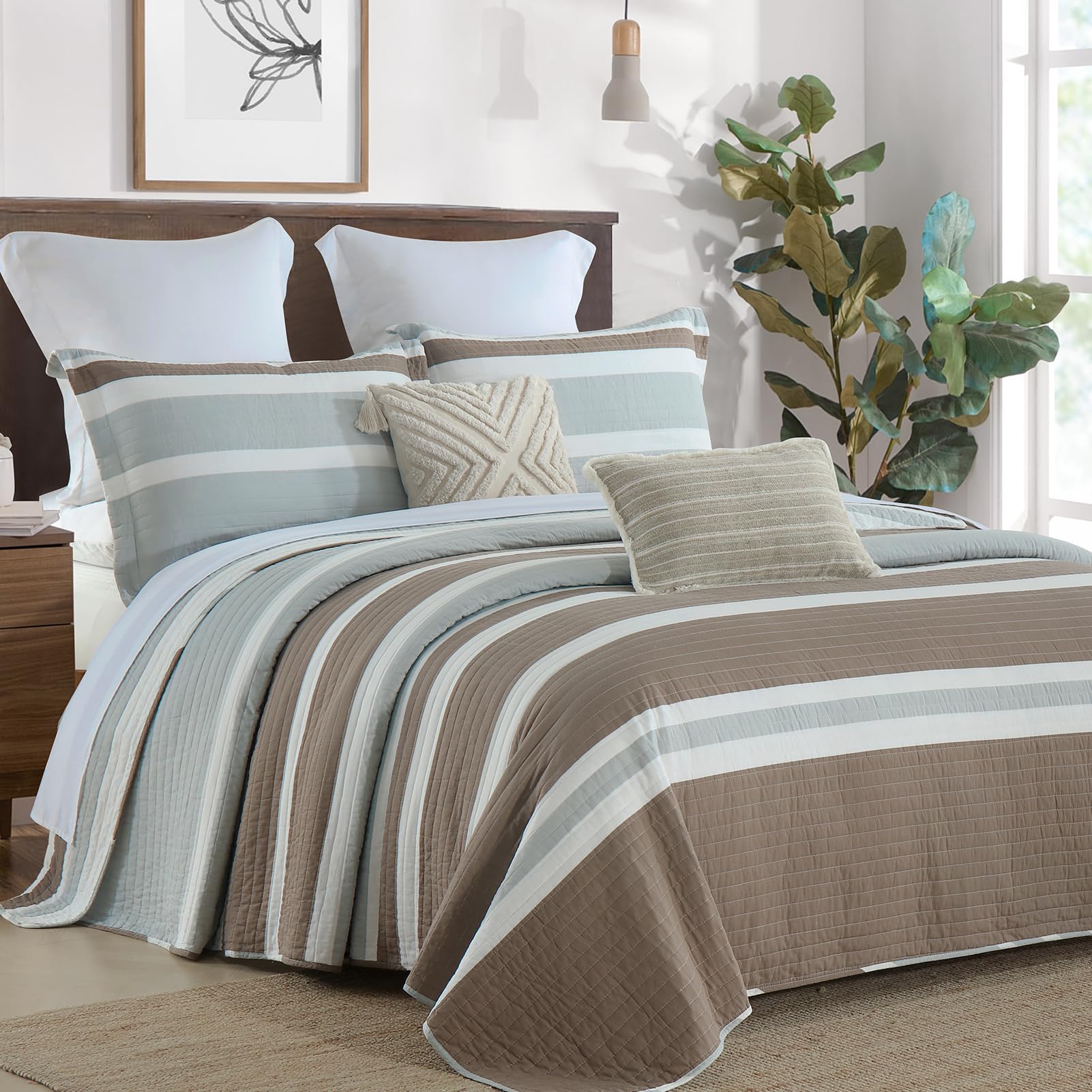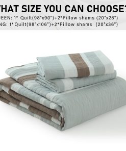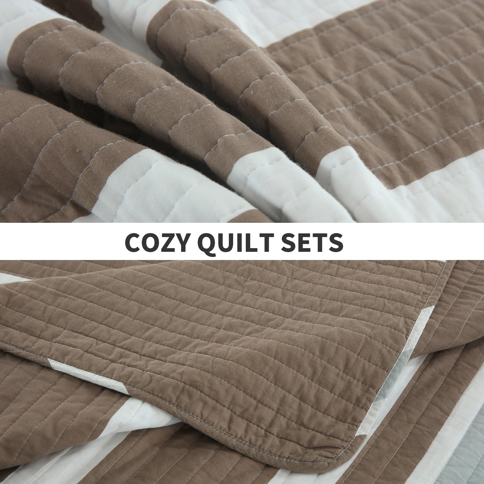 2. Ampliamente Aplicable y Decorativo: Esta clásica colcha en marrón, gris y blanco diseñada con patrones a rayas hace que su habitación sea luminosa y acogedora. Este juego de colcha decorativo también puede combinar fácilmente con la decoración de su dormitorio, sala de estar, habitación principal, habitación de invitados, estudio, airbnb, dormitorios y RVs.