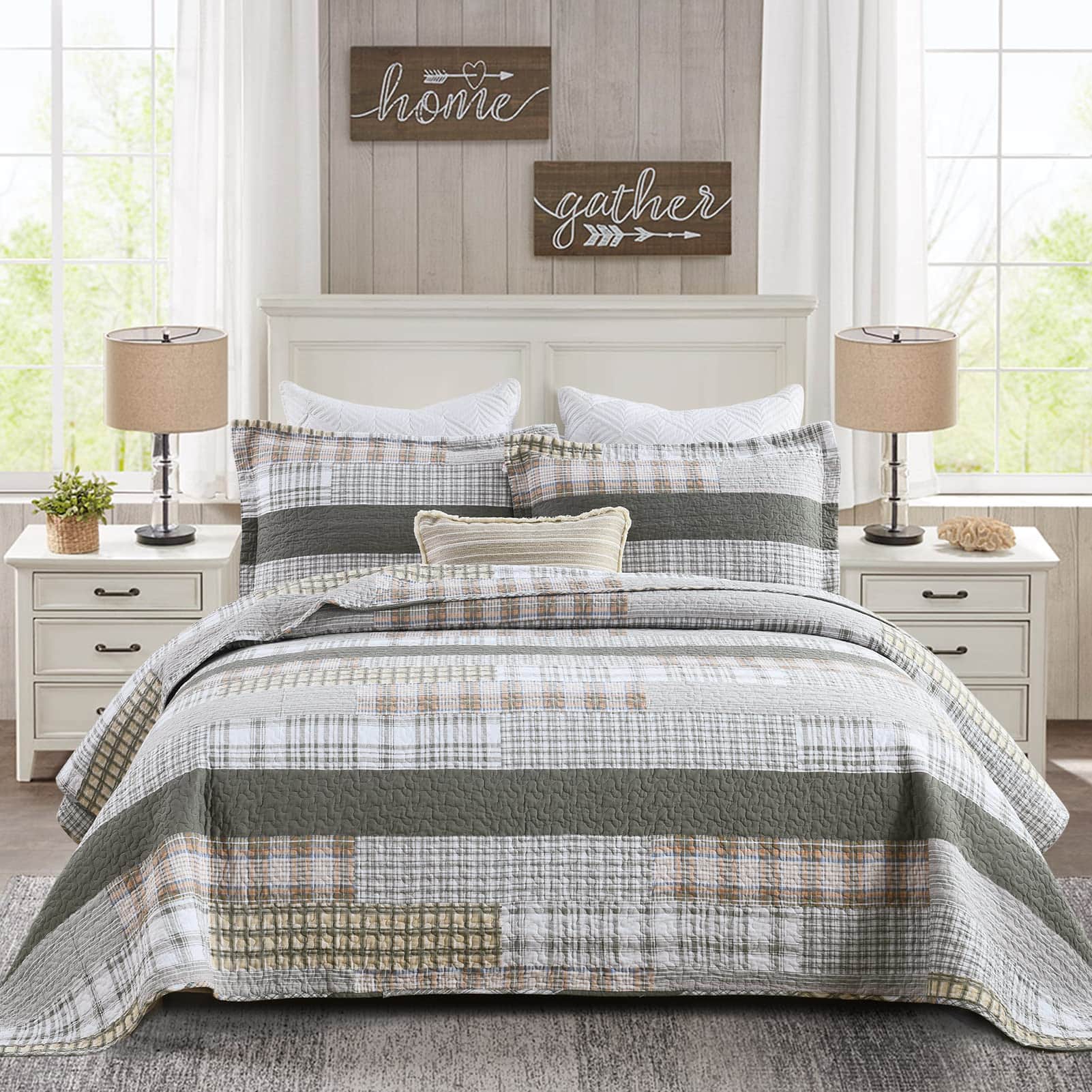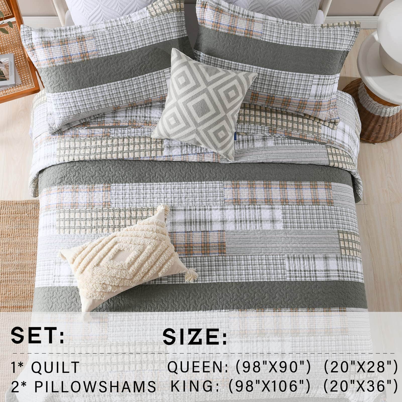 2. Patrón a Cuadros – El juego de colcha queen está decorado con un patrón a cuadros de patchwork y adopta una excelente artesanía de doble costura, que se puede combinar fácilmente con la decoración de su habitación. Es adecuado para habitaciones, salas de estar, habitaciones principales, habitaciones de invitados, estudio, airbnb, dormitorios y RVs. Y es ligero y portátil para habitaciones interiores y camping al aire libre.